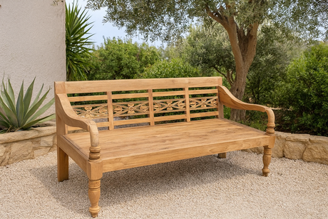 Das Modell Java ist der Klassiker in unserem Bahnhofsbank-Sortiment. Ein charakteristisches Merkmal ist das schmuckvolle Blumenmotiv, das die Rückenlehne ziert. Unser Sortiment umfasst vier Modell-Typen in der Länge 120 cm, 150 cm, 190 cm und 240 cm. Aufgrund der großen Nachfrage ist diese Teakholz-Bank auch als Gartenstuhl-Variante mit einer 60 cm breiten Sitzfläche erhältlich.