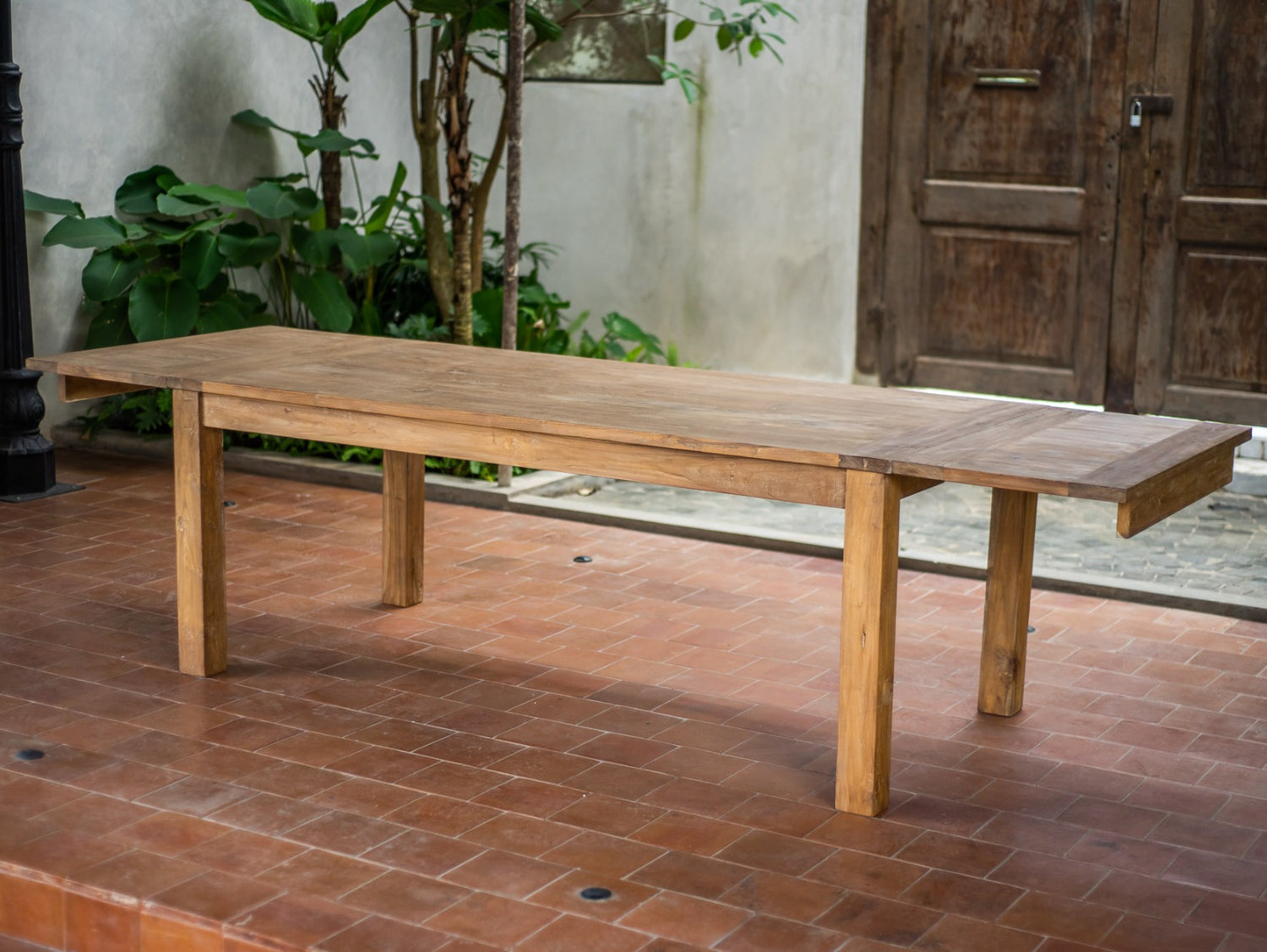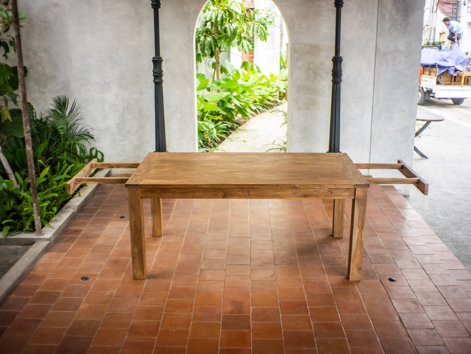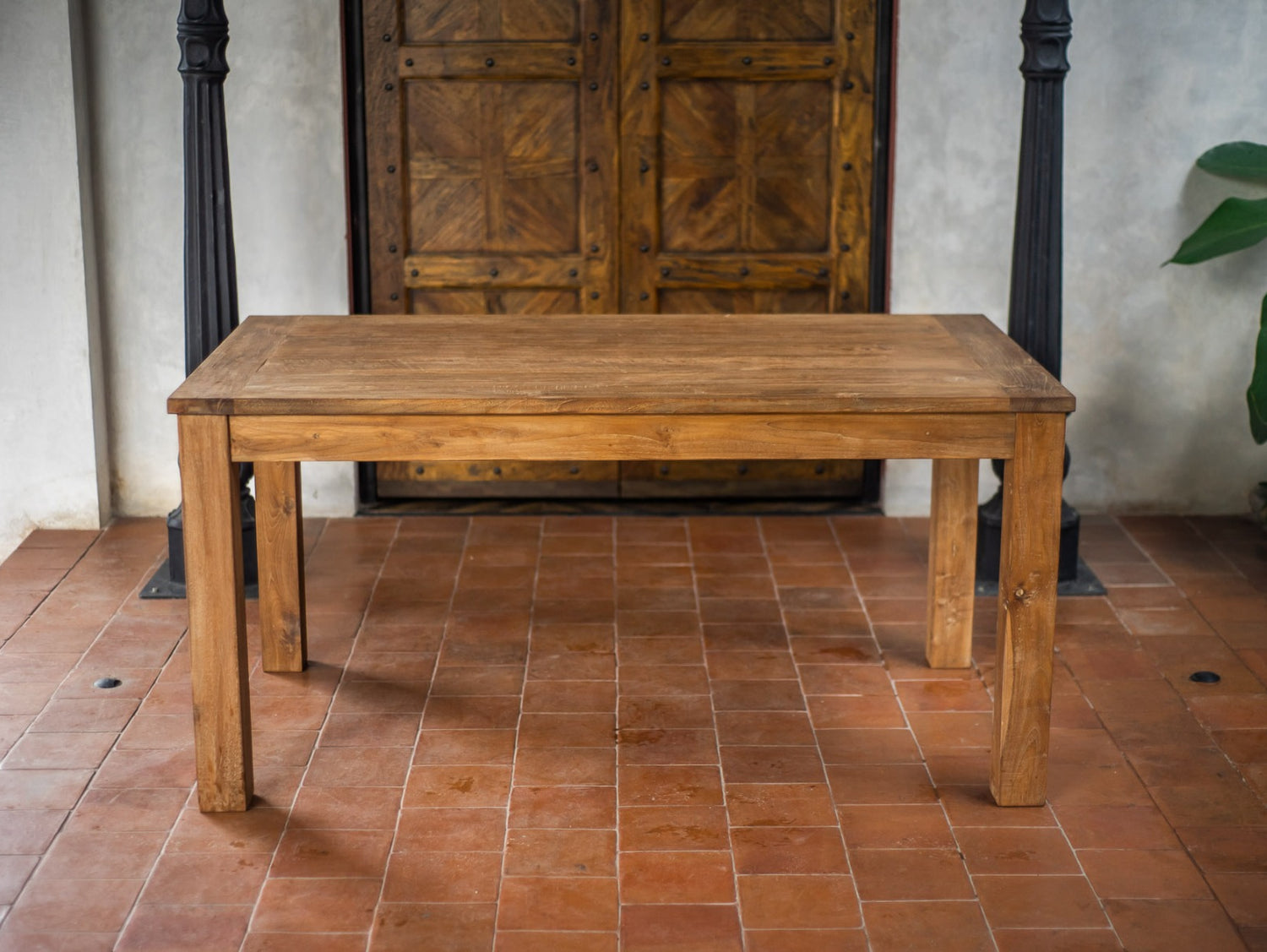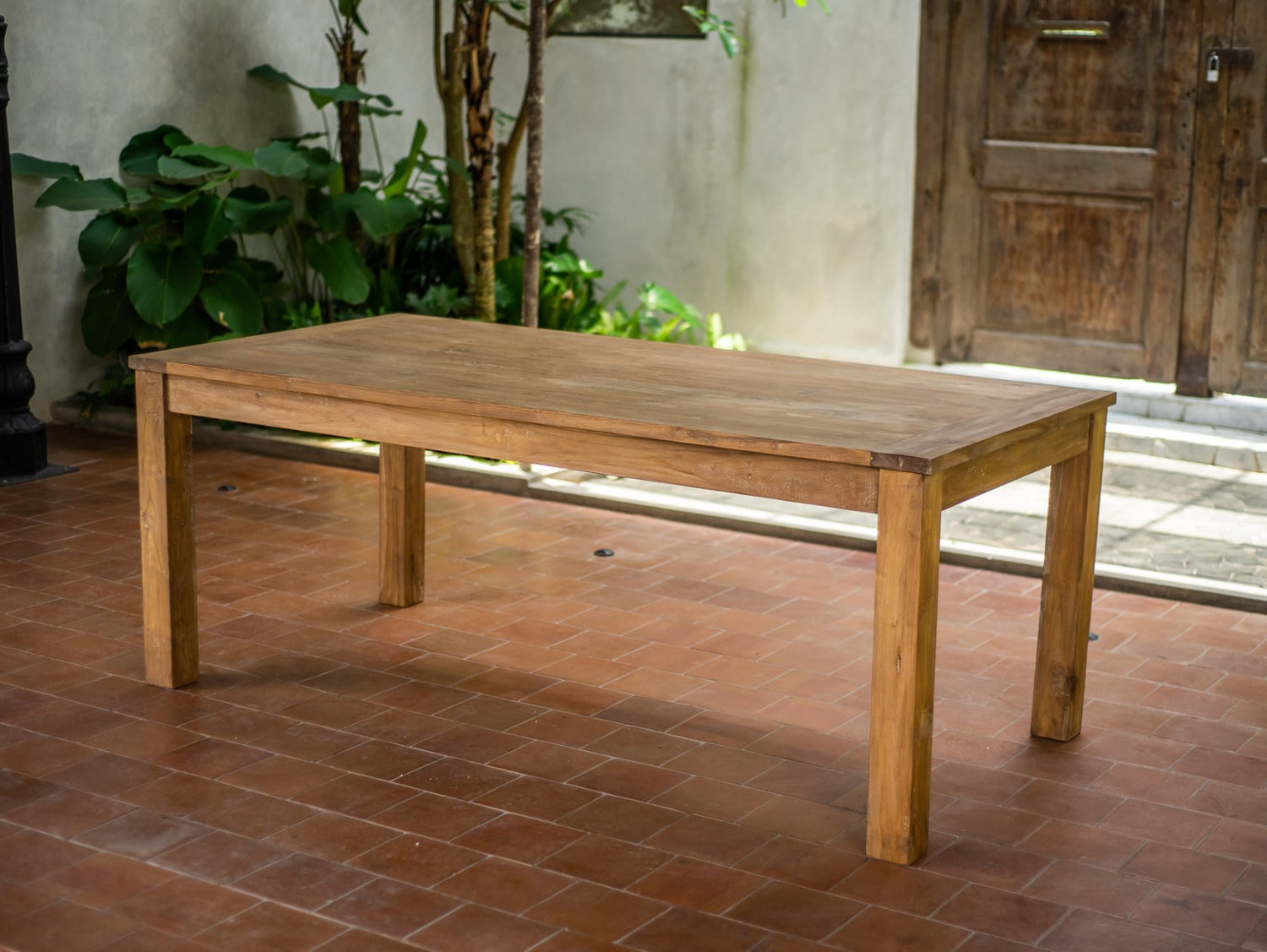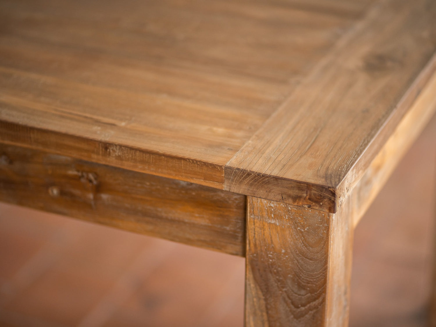 Die rustikale Oberfläche und das hochwertige Teakholz verleihen dem Tisch einen warmen, zeitlosen Charakter, während die stabilen, quadratischen Blockbeine für einen sicheren Stand sorgen.