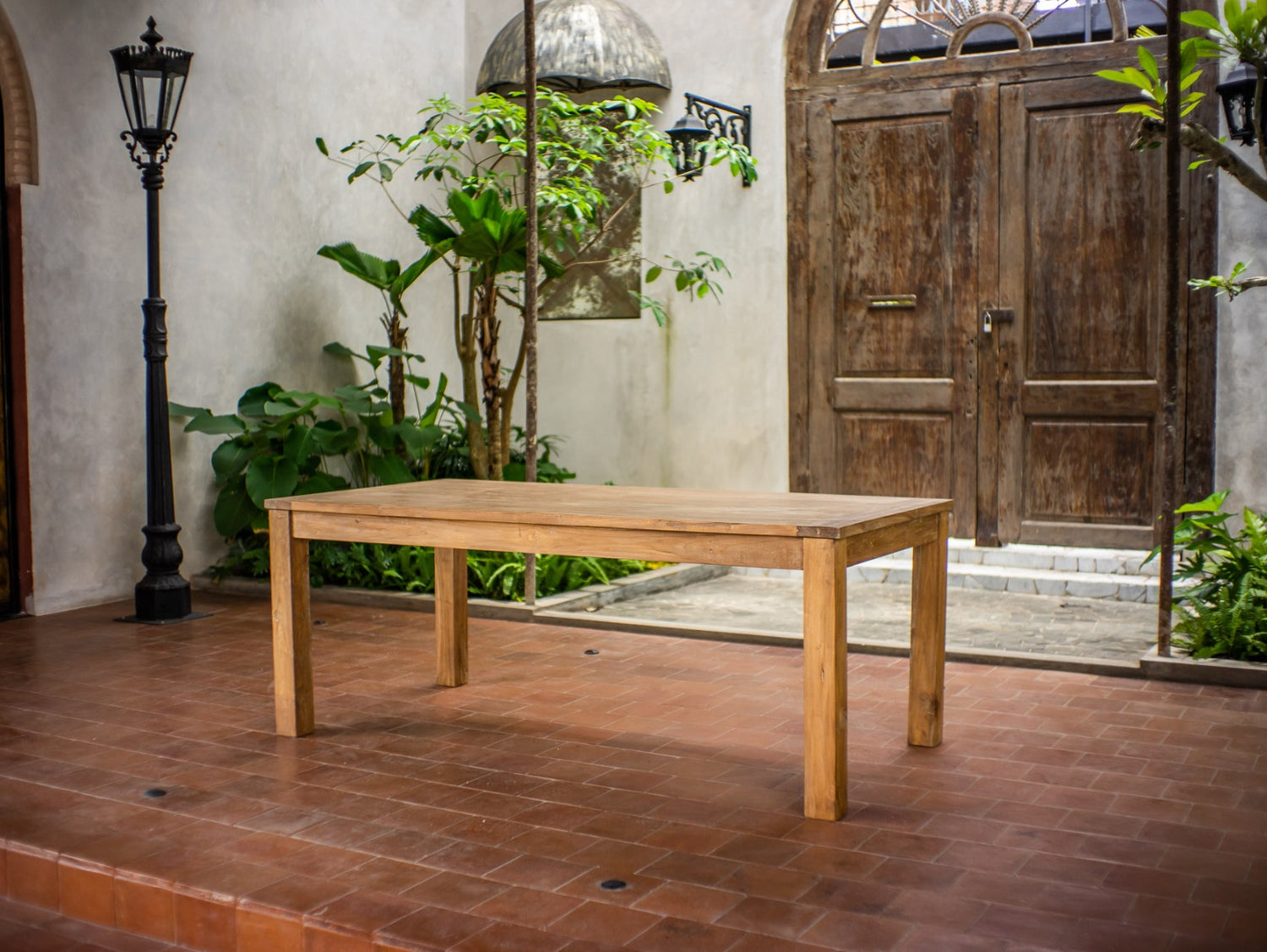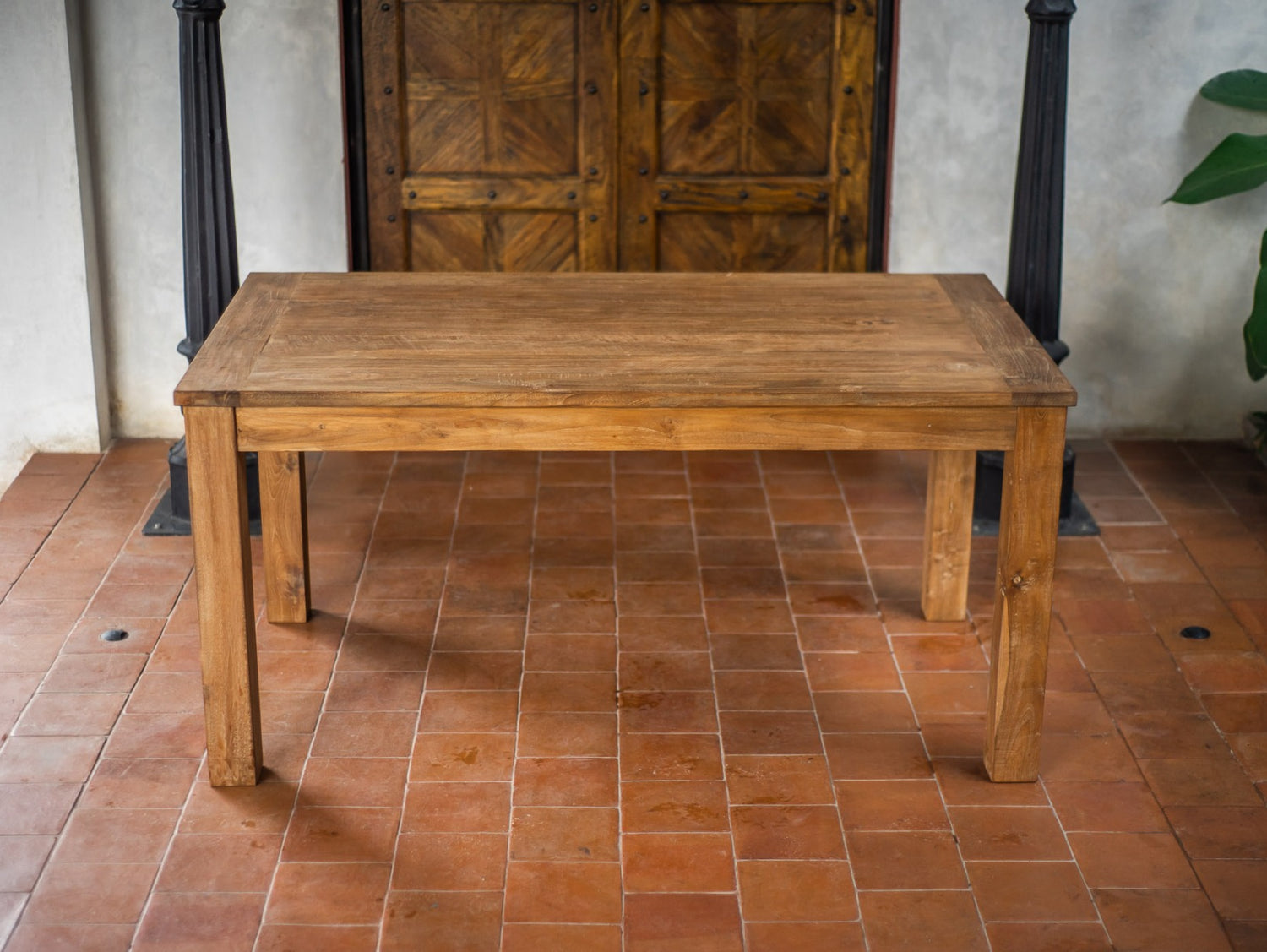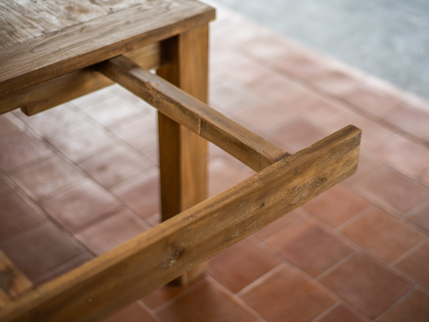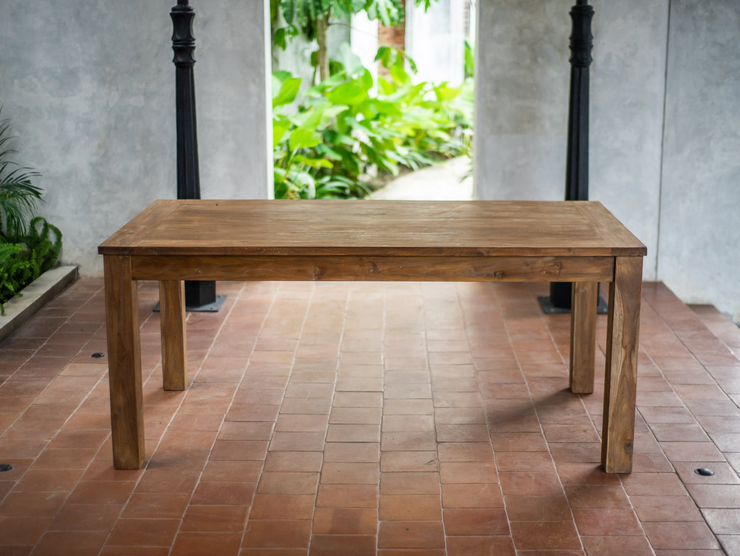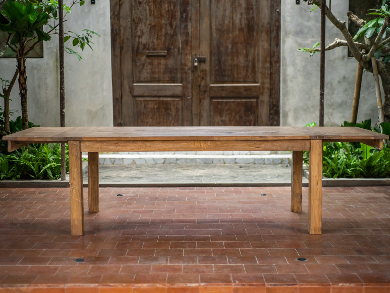Die rustikale Oberfläche und das hochwertige Teakholz verleihen dem Tisch einen warmen, zeitlosen Charakter, während die stabilen, quadratischen Blockbeine für einen sicheren Stand sorgen.