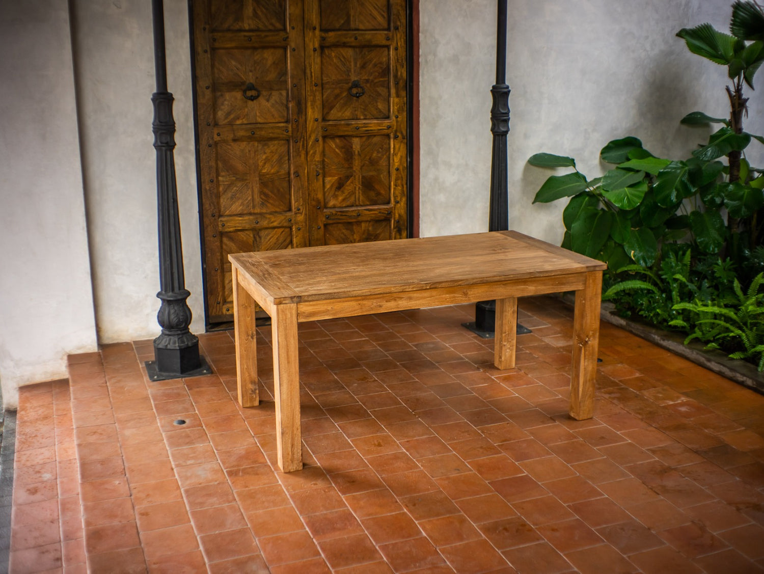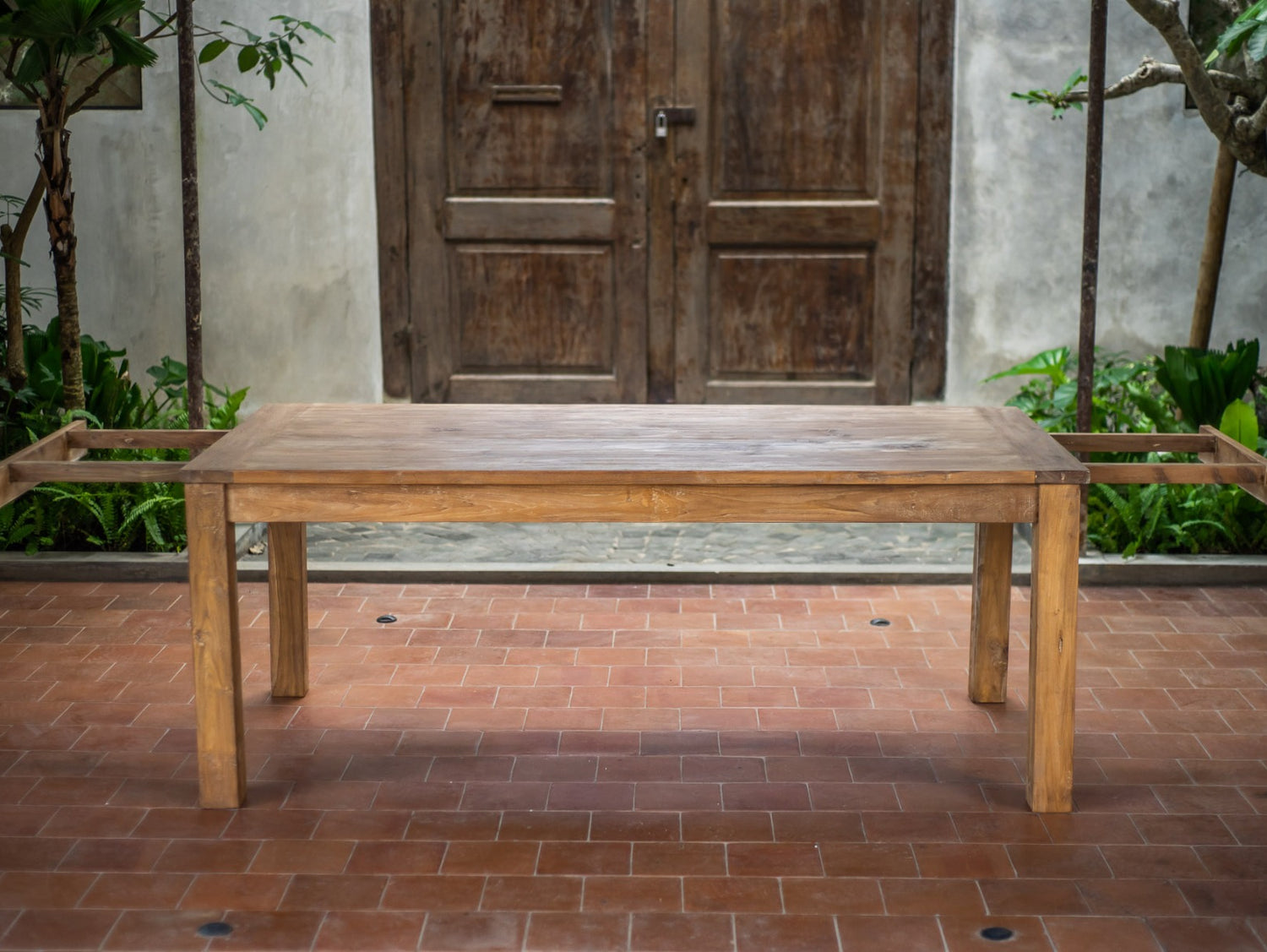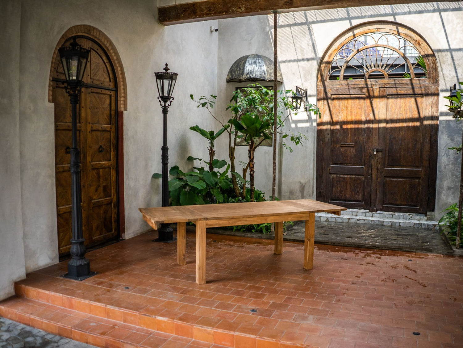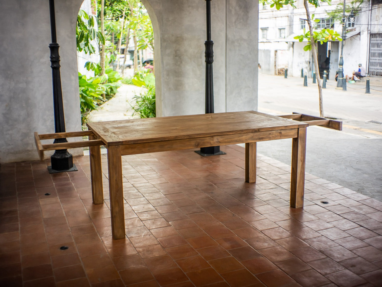 Die rustikale Oberfläche und das hochwertige Teakholz verleihen dem Tisch einen warmen, zeitlosen Charakter, während die stabilen, quadratischen Blockbeine für einen sicheren Stand sorgen.