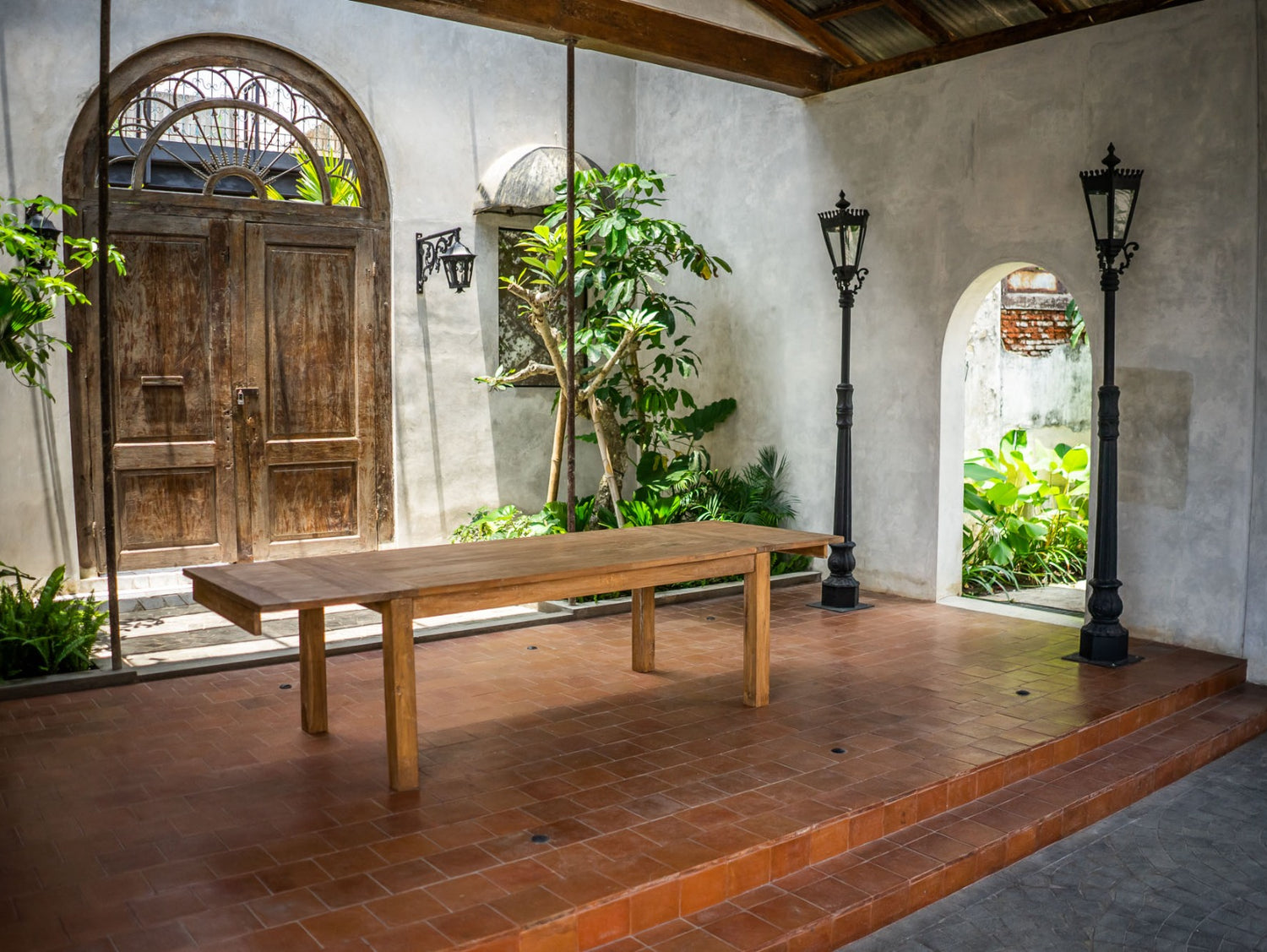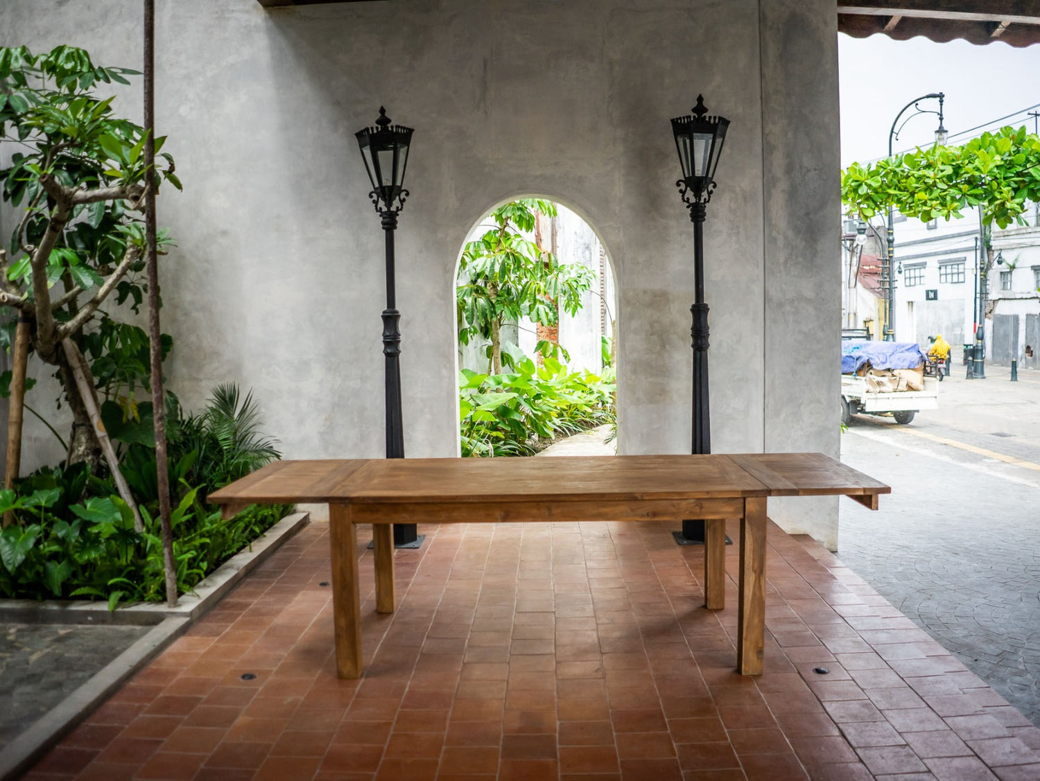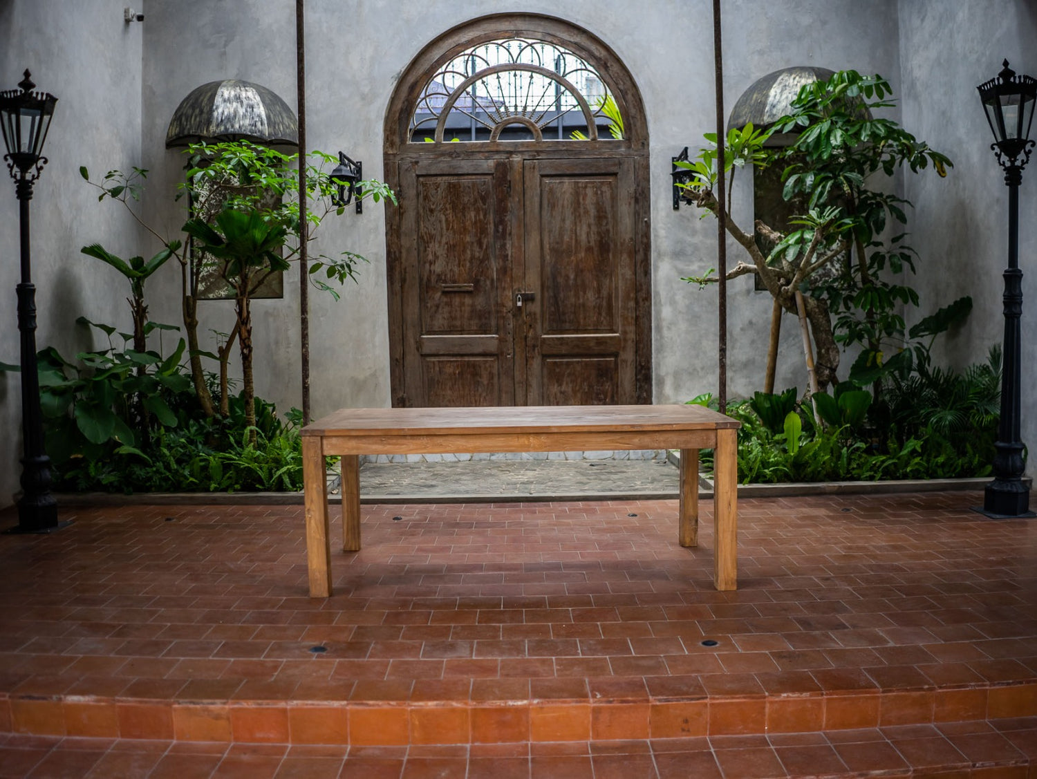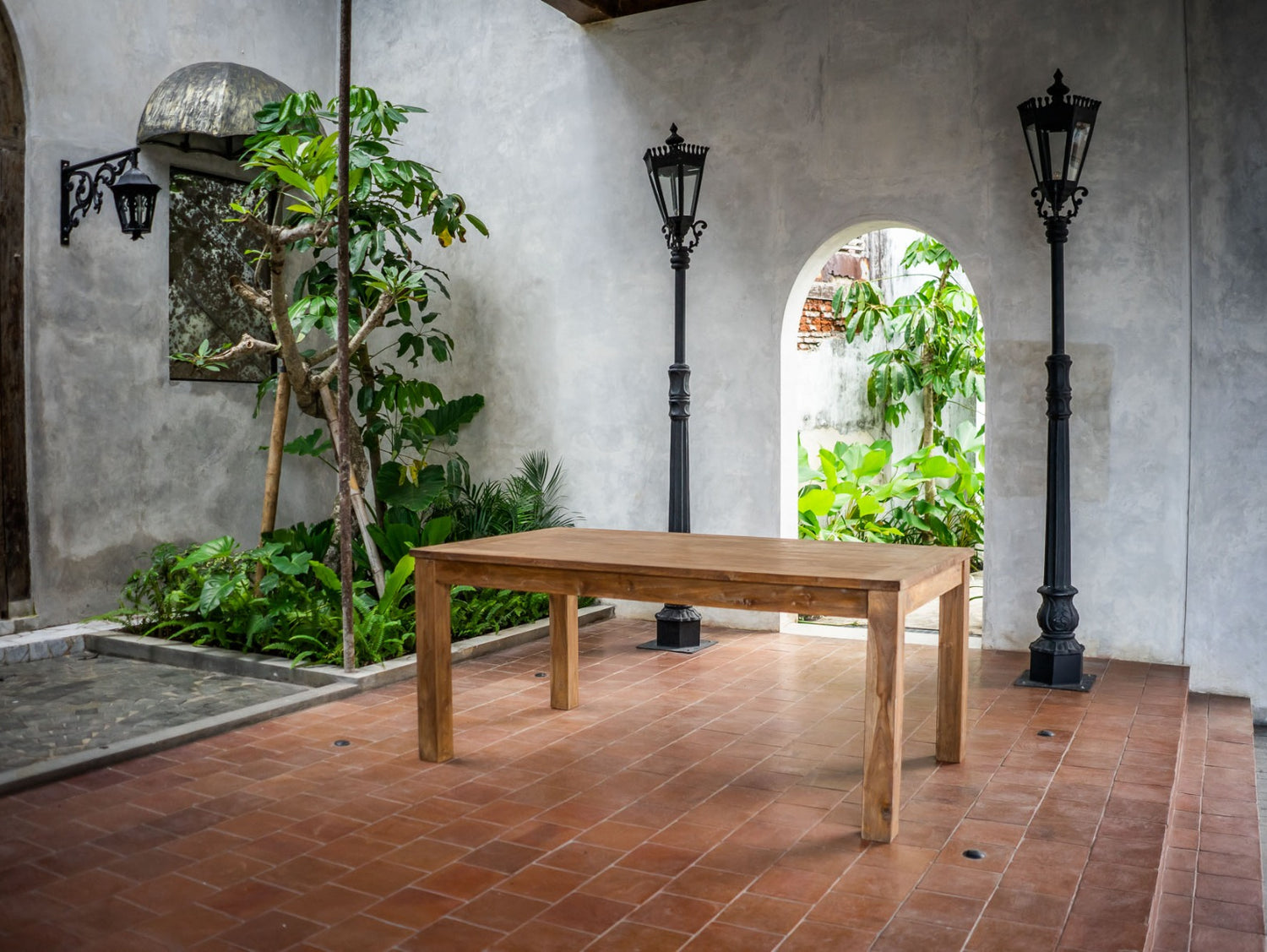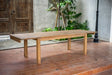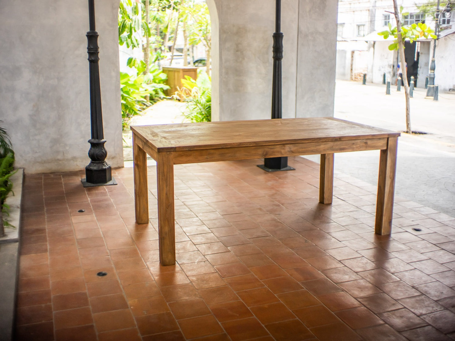 Die rustikale Oberfläche und das hochwertige Teakholz verleihen dem Tisch einen warmen, zeitlosen Charakter, während die stabilen, quadratischen Blockbeine für einen sicheren Stand sorgen.