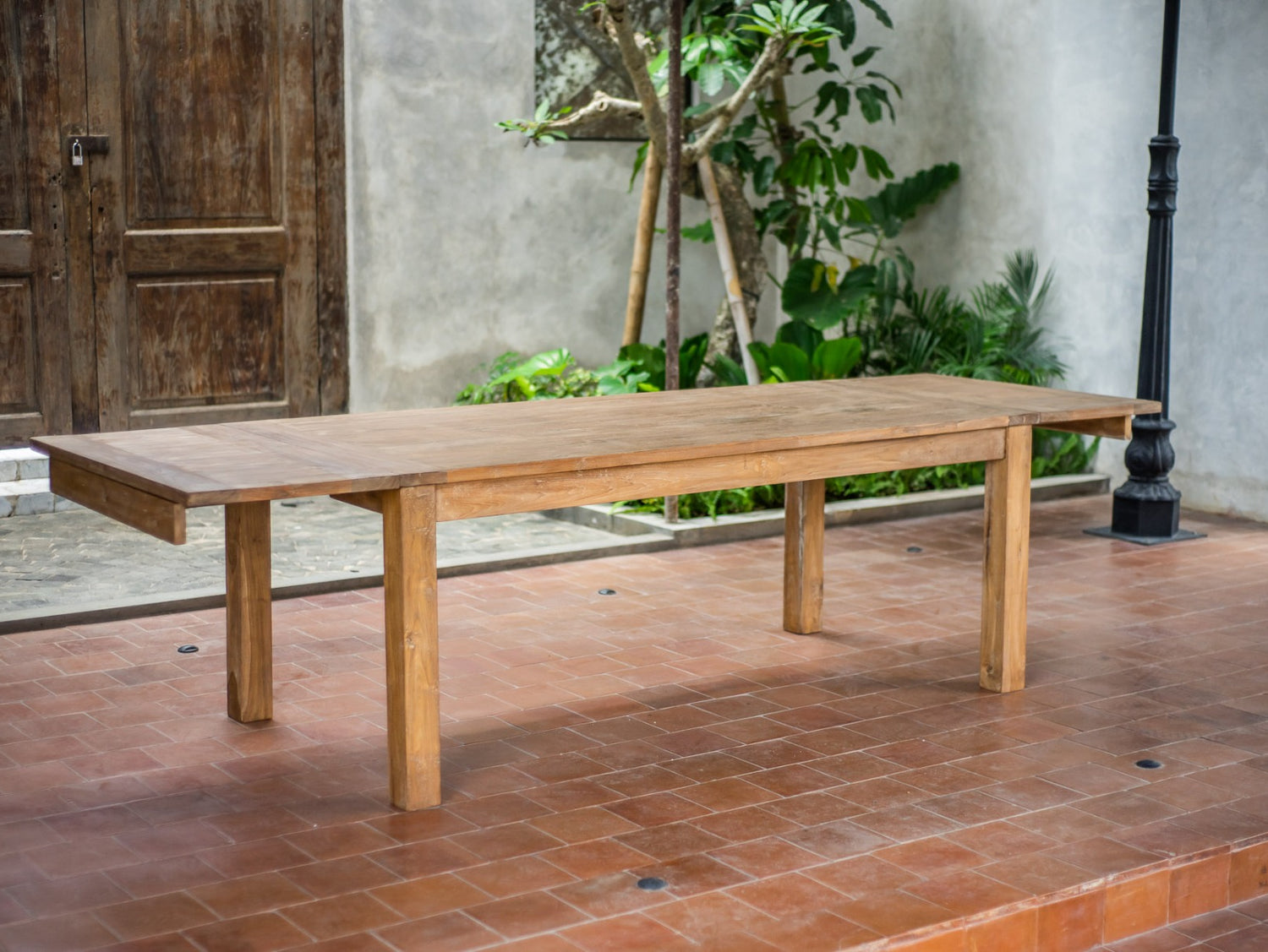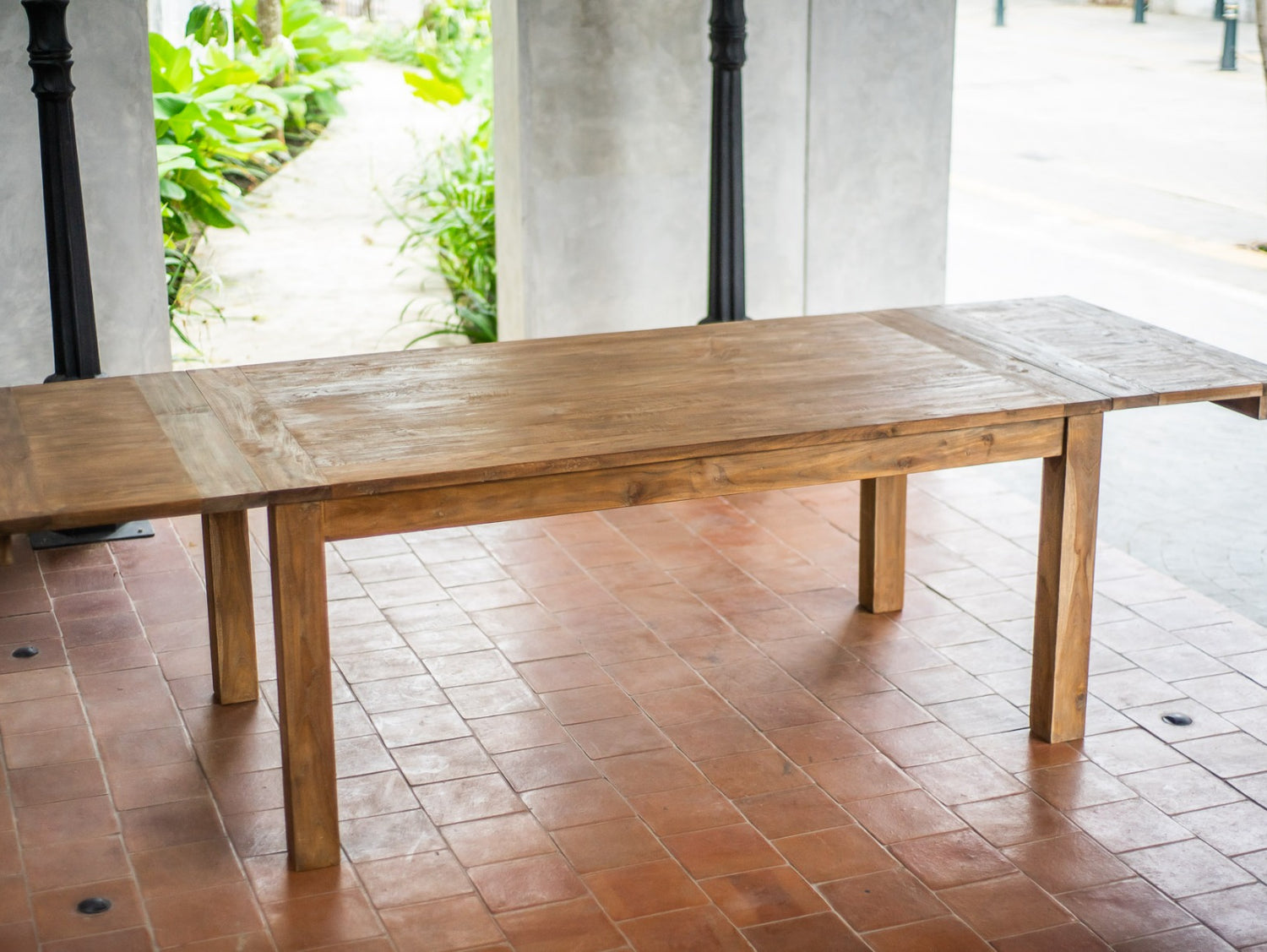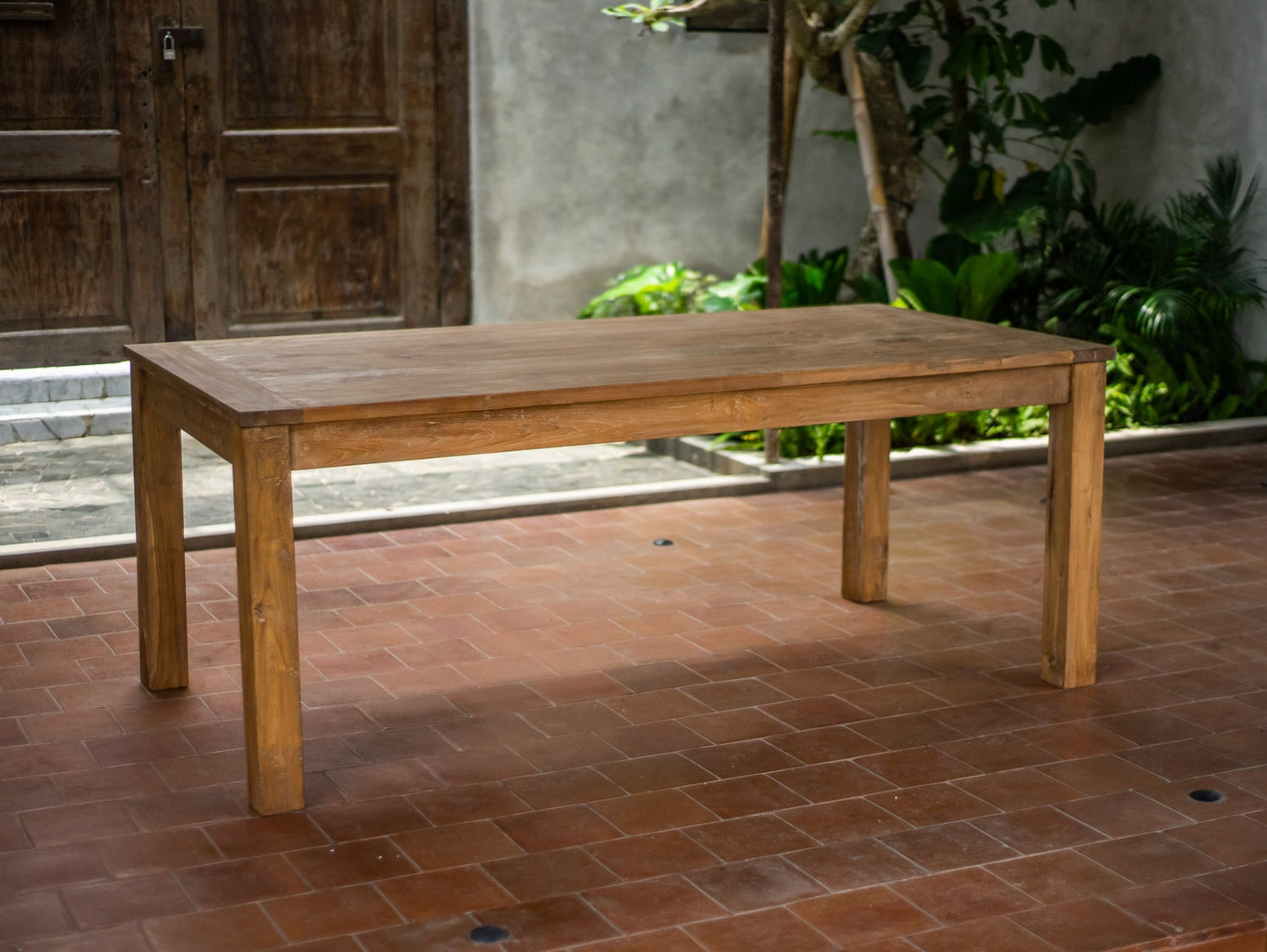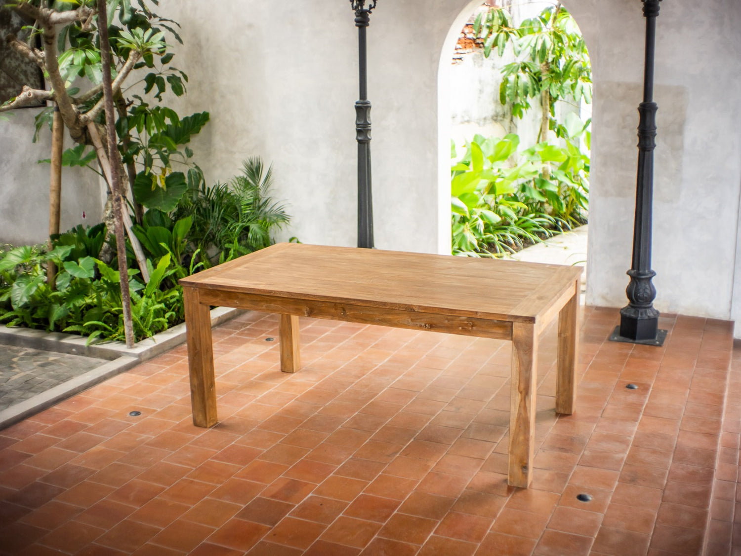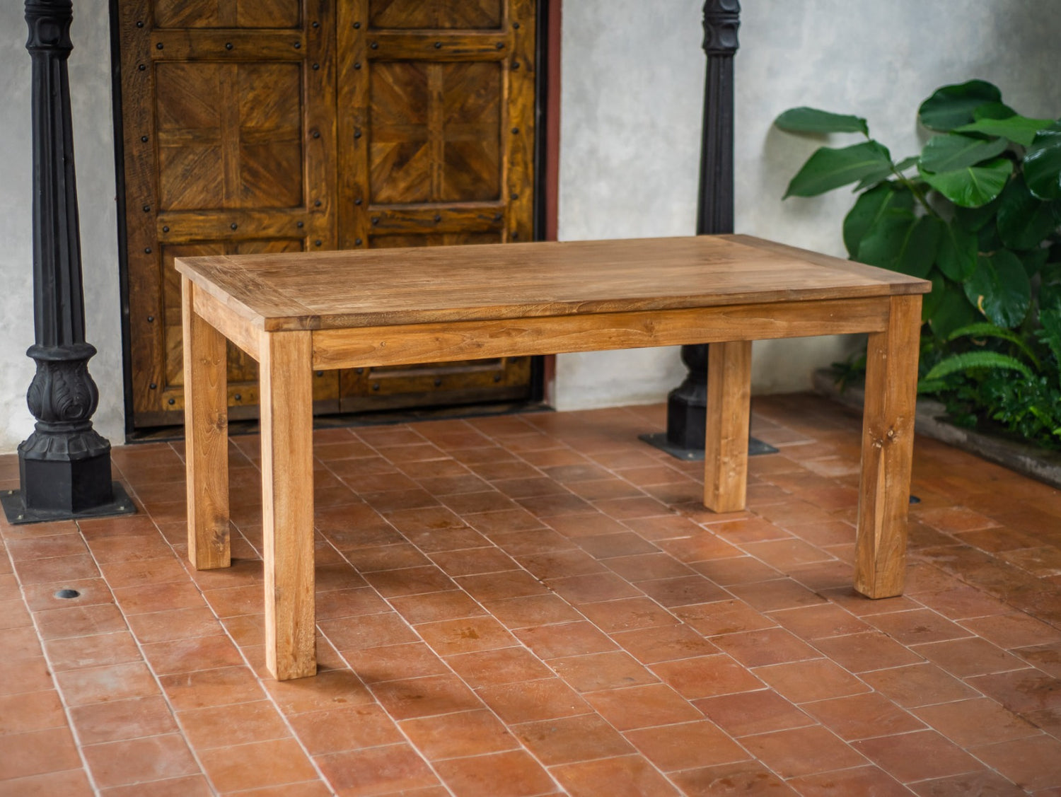 Teakholz ist pflegeleicht. Regelmäßiges Reinigen mit einem feuchten Tuch und einer milden oder grünen Seifenlösung hält das Holz in gutem Zustand. Bei Teakholz-Gartentischen empfehlen wir mindestens 1-2 Mal im Jahr eine gründliche Reinigung, um Ablagerungen wie Algen oder Moos vorzubeugen. Bei Tischen mit Schraubbeinen jährlich prüfen, ob alles fest sitzt.