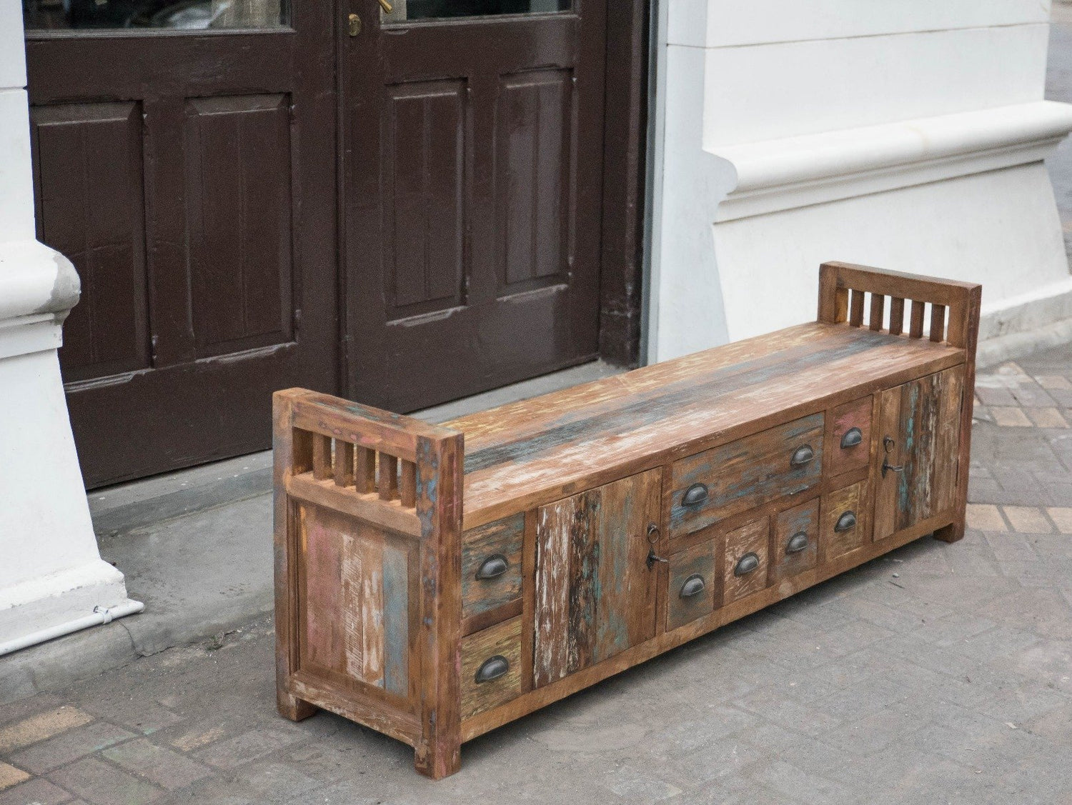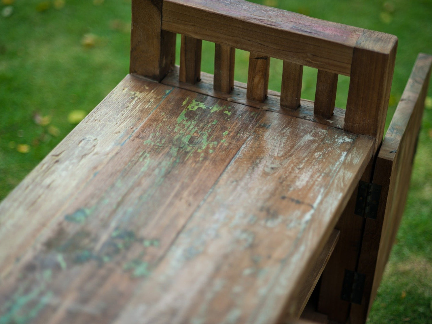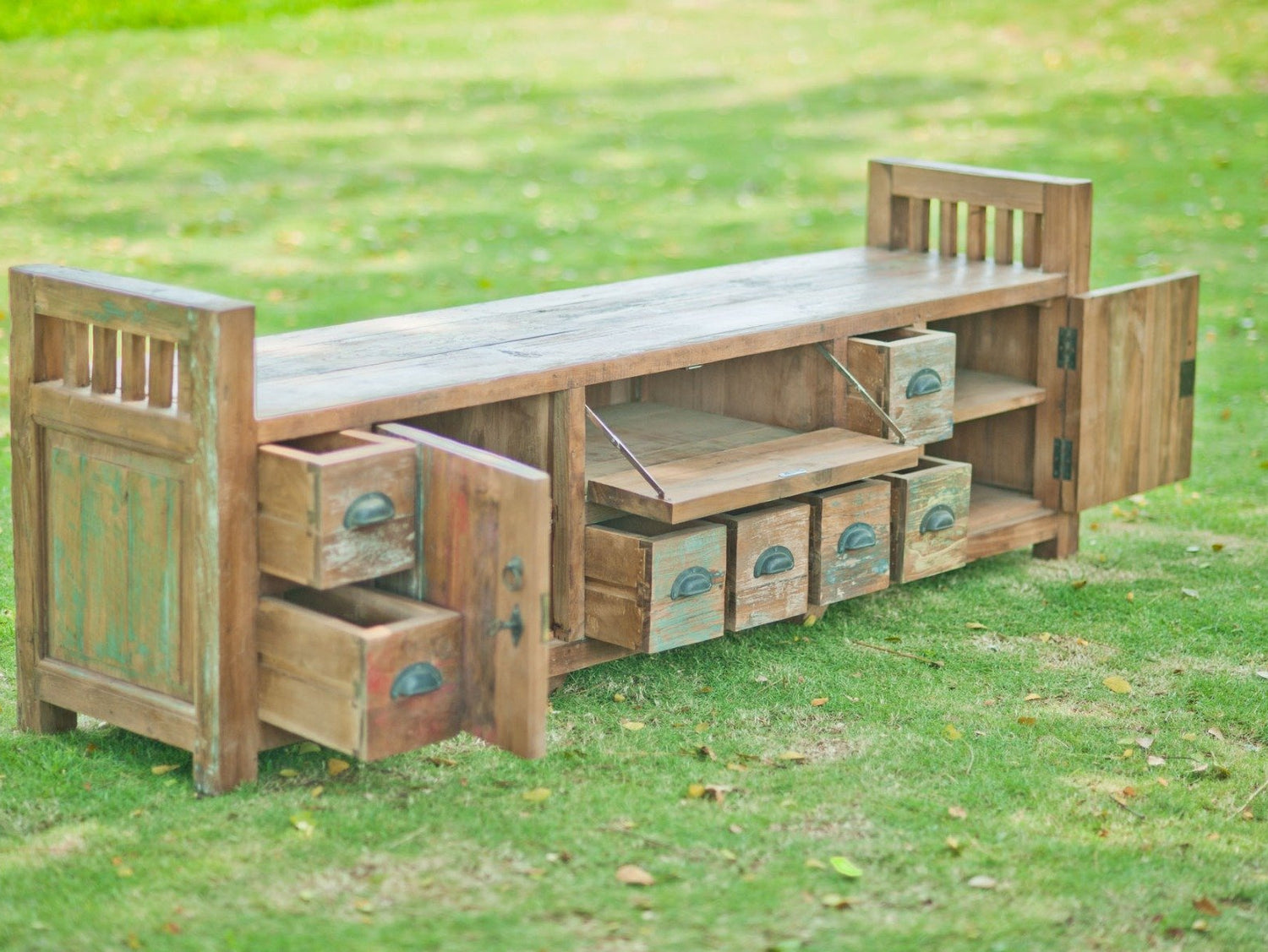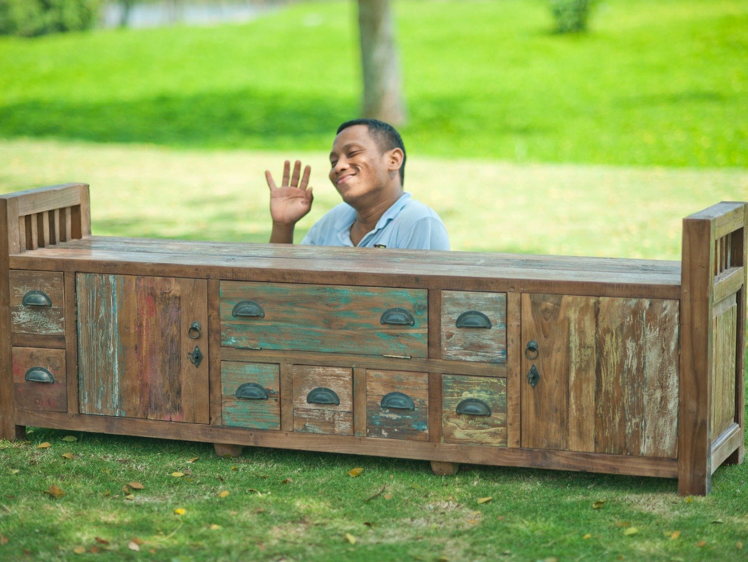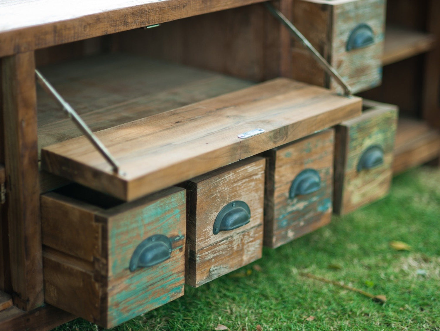 Für die Herstellung wurde altes Teakholz aus Indonesien verwendet, das früher für den Bau traditioneller Holzhütten benutzt wurde. Dieses Holz besitzt eine unvergleichliche Ausstrahlung und trägt auf der Oberfläche die Reste des einstigen Anstrichs. Zahlreiche Schubladen bieten Stauraum für Haushaltsutensilien und Dekoartikel. Rechts und links befinden sich einflügelige Türen mit einem Regalfach und in der Mitte bietet ein Klappfach zusätzlich Raum zum Verstauen diverser Kleinartikel. Ein reizvolles Detail sind die durchbrochenen Seitenwände des Teak Lowboards, die über die Oberfläche des Möbelstückes hinausragen.