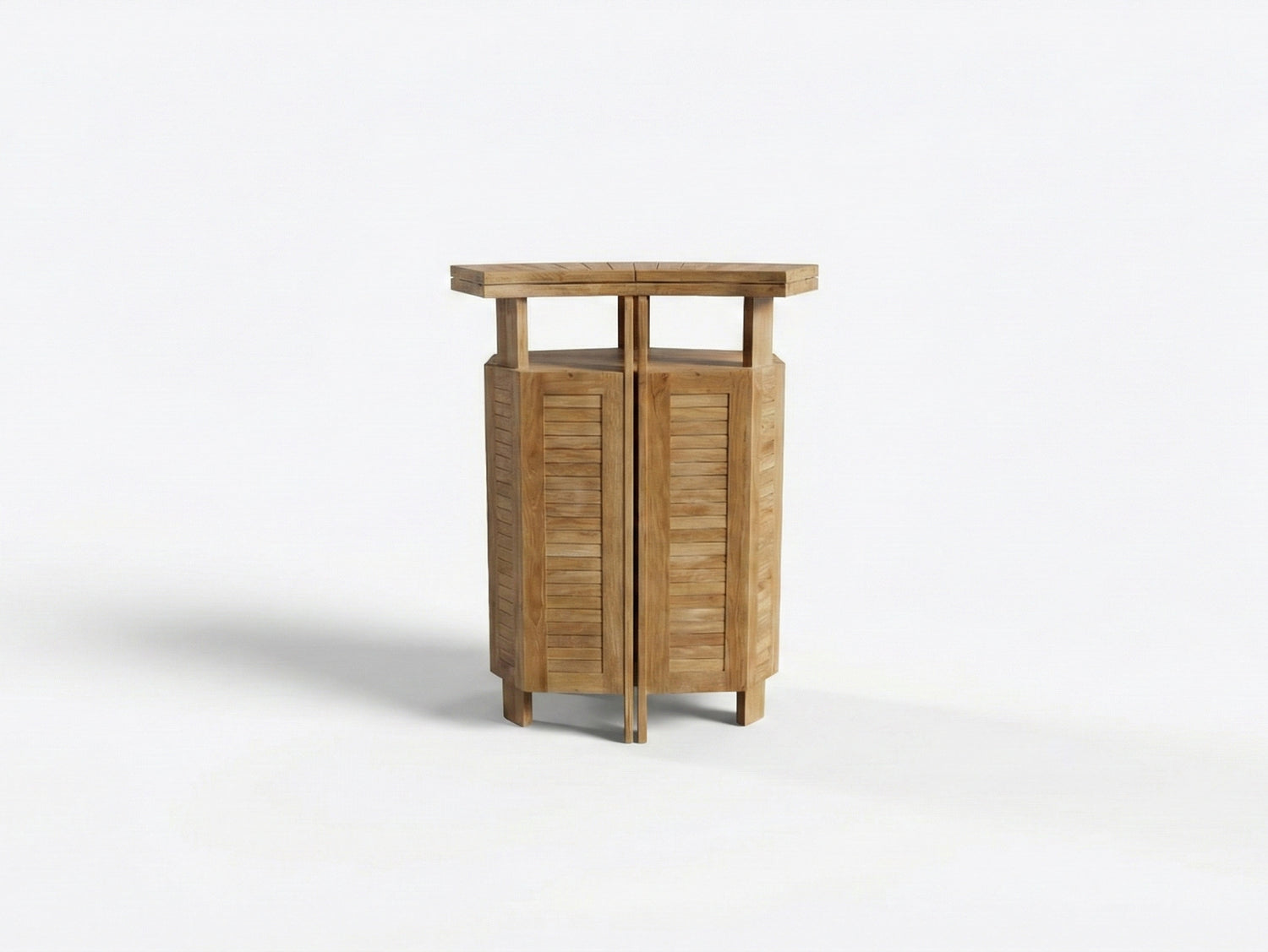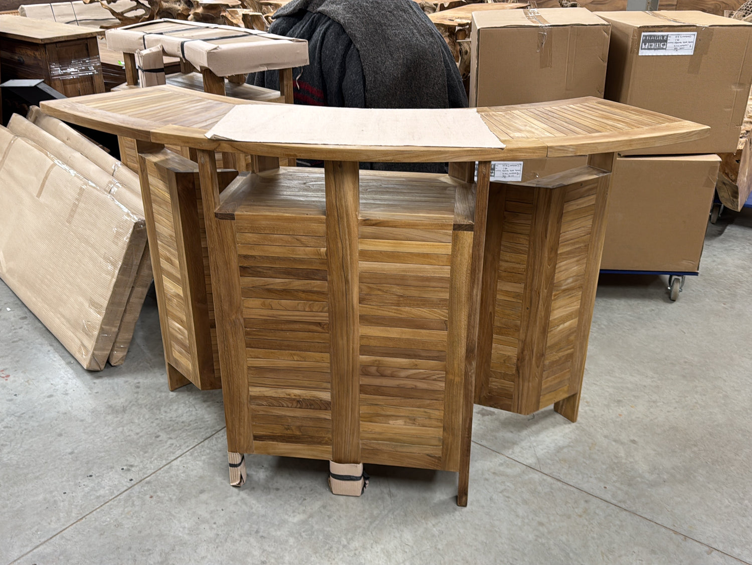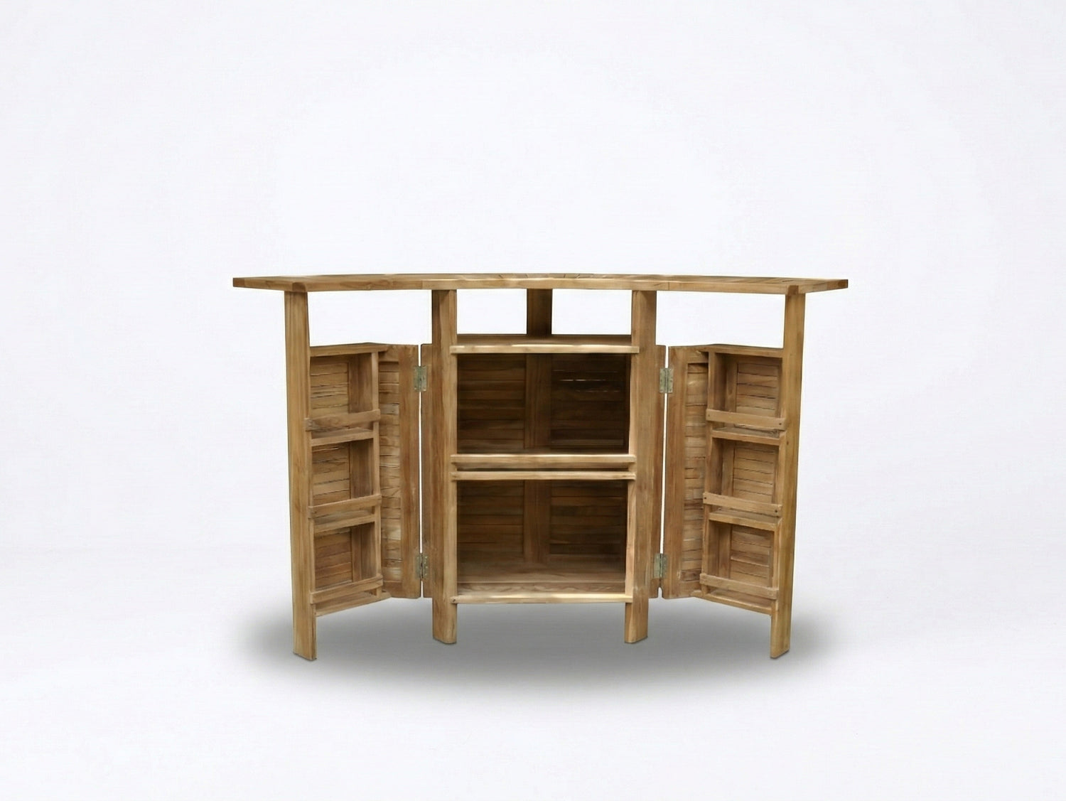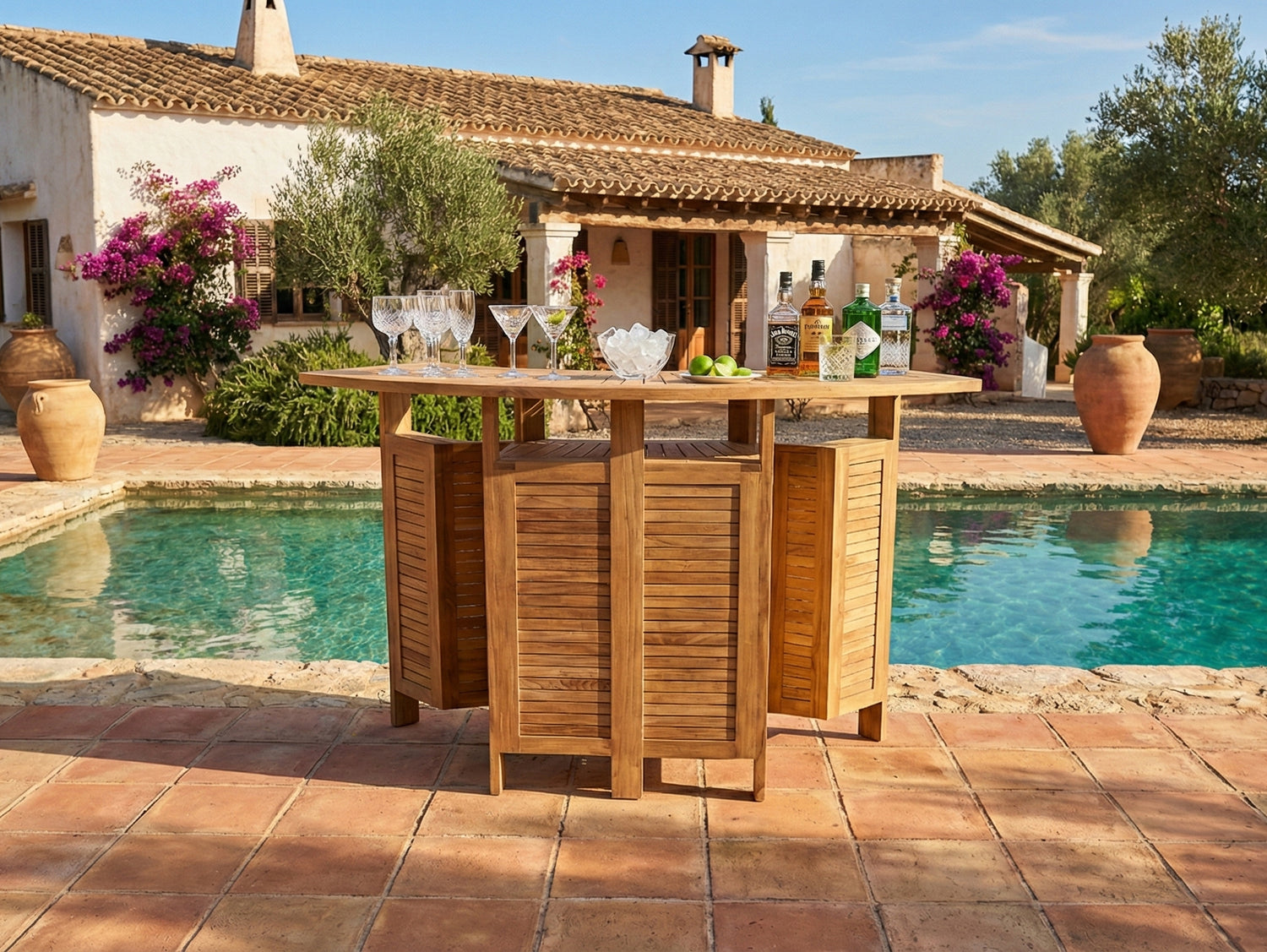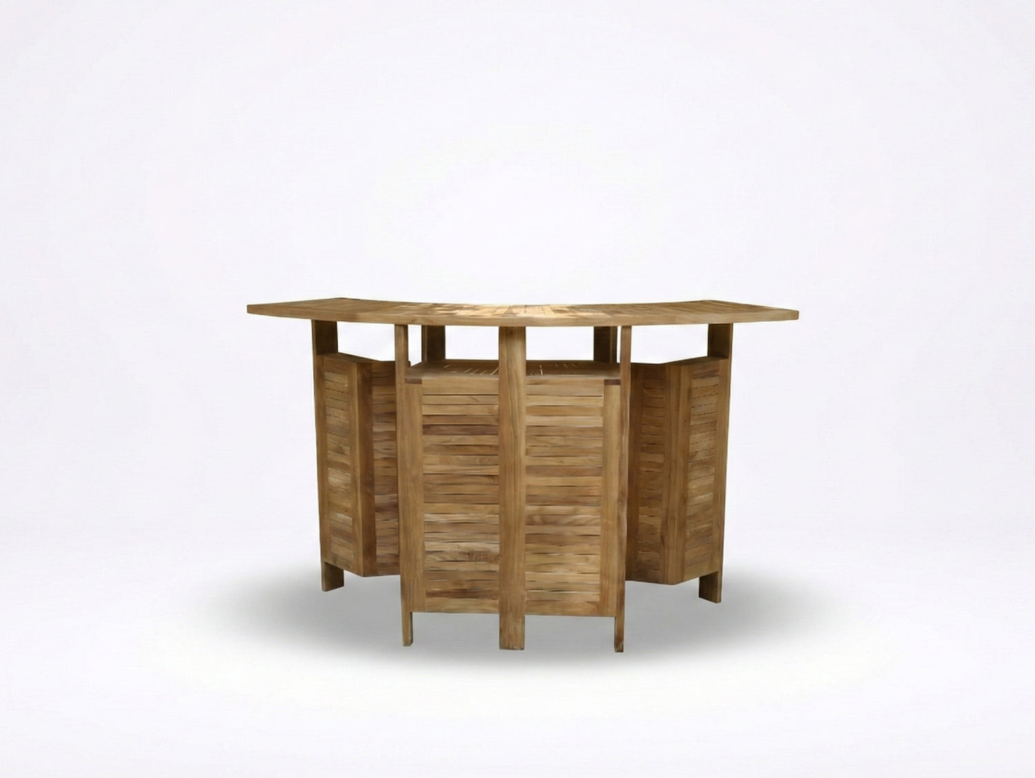 Gefertigt aus hochwertigem, widerstandsfähigem Teakholz, ist diese Bar extrem langlebig und robust. Sie eignet sich hervorragend für den Einsatz im Innenbereich sowie im geschützten Außenbereich (z.B. überdachte Terrasse).
