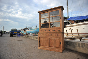 Das Oberteil des Teak Schrankes besteht aus zwei verglasten Schiebetüren, die gegeneinander verschoben werden können. Dahinter befinden sich drei Regalböden, auf denen gut sichtbar Dekoartikel oder Geschirr platziert werden können. Darunter schließen sich fünf kleine Schubkästen an, die über Muschelgriffe aus dunklem Metall bedient werden. Das Unterteil setzt sich aus zwei Schiebetüren aus Massivholz und vier darüberliegenden Schubladen zusammen. Das gesamte Möbelstück besteht aus Recycling-Holz von der indonesischen Insel Java.