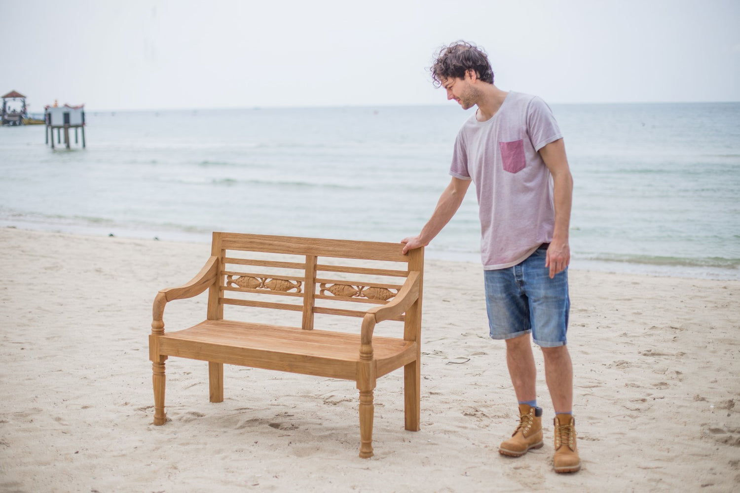 Ein stilvoller Einrichtungsgegenstand mit einer unverwechselbaren Optik ist die Teak Bahnhofsbank Fish. Als Vorlage für das Design dienten historische Bahnhofsbänke aus Südostasien, wie sie noch heute teilweise auf Bahnsteigen und in Wartehallen in Indonesien zu finden sind. Typisch für diese Bahnhofsbänke ist die kunstvoll verzierte Rückenlehne. Bei diesem Modell wählte der Künstler ein maritimes Motiv. Deutlich zu erkennen sind die geschnitzten Fischkörper in der Mitte der zweigeteilten Rückenlehne. Sie werden von einzelnen Leisten eingerahmt.