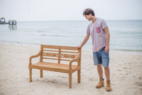 Ein weiteres Designmerkmal ist die geschwungene Armlehne der Teak Bahnhofsbank Fish. Die Form spiegelt sich in den beiden Vorderbeinen wider, die kunstvoll gedrechselt wurden. Die Sitzfläche der Bahnhofsbank wurde aus einzelnen Holzplanken zusammengesetzt. Im Gegensatz zu Outdoor-Modellen befinden sich keine Regenwasser-Ablaufschlitze zwischen den einzelnen Planken. Die Bahnhofsbank Fish ist in verschiedenen Größen erhältlich. Das kleinste Modell ist 120 cm lang, während die größte Bank 240 cm in der Länge misst.