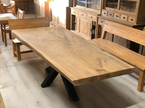 Dieser Teak Baumstammtisch Suar mit 2,5 Meter Länge besticht durch seine organische Form, massive 8 cm Stärke und eine natürliche Oberfläche, die jede Maserung einzigartig betont. Mit Maßen von 113 × 100 × 86 cm und einer Höhe von 77 cm fügt sich dieser Tisch perfekt in großzügige Essbereiche ein und sorgt als einzigartiger Blickfang für Wohnräume mit Stil.