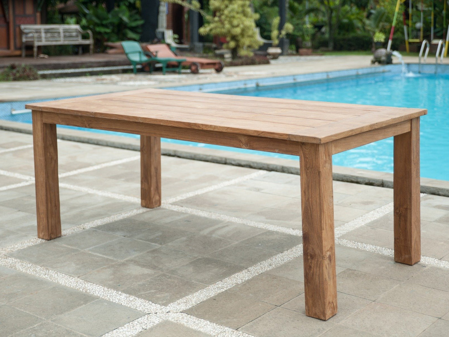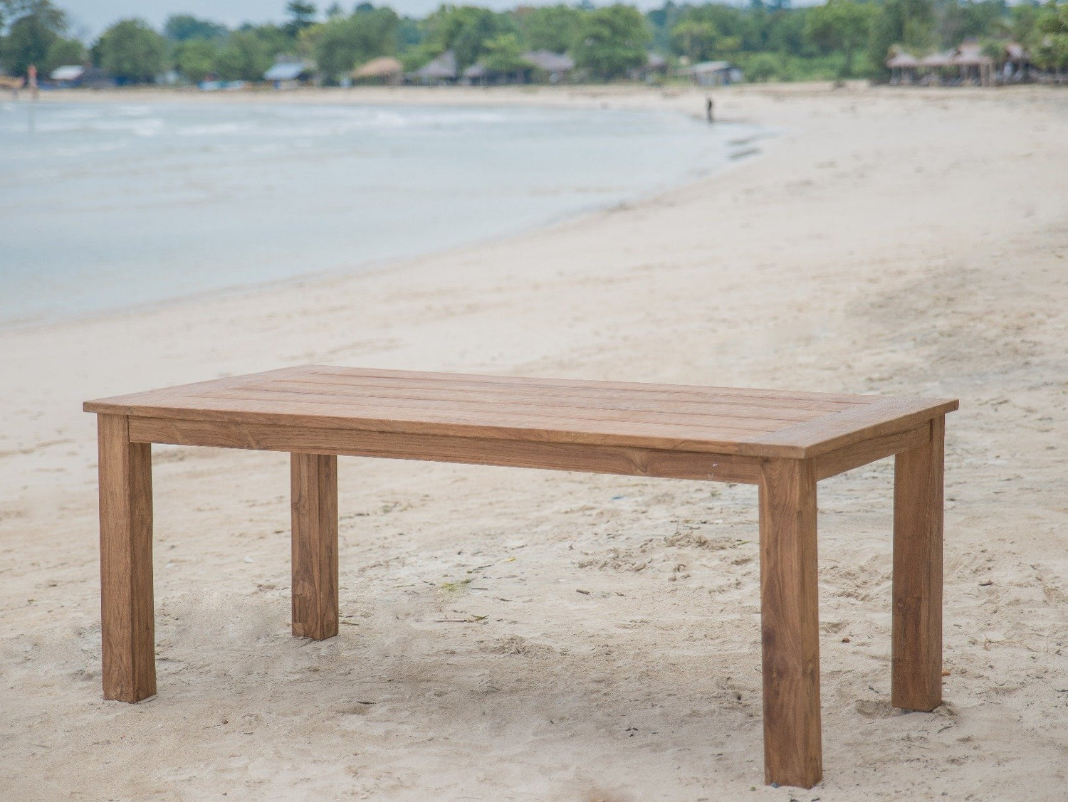 Teakholz ist pflegeleicht. Regelmäßiges Reinigen mit einem feuchten Tuch und einer milden oder grünen Seifenlösung hält das Holz in gutem Zustand. Bei Teakholz-Gartentischen empfehlen wir mindestens 1-2 Mal im Jahr eine gründliche Reinigung, um Ablagerungen wie Algen oder Moos vorzubeugen. Bei Tischen mit Schraubbeinen jährlich prüfen, ob alles fest sitzt.