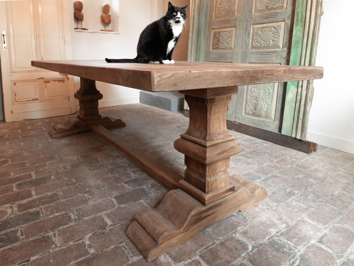Die extradicke Tischplatte wurde aus recyceltem Teakholz hergestellt. Dieses alte Holz punktet mit einer wundervoll lebendigen Oberfläche, die dem Tisch eine rustikale Optik verleiht. Winzige Gebrauchs- und Abnutzungsspuren sind ein Beleg für die erlebte Geschichte des Hartholzes. Der Teak Klostertisch ist in unterschiedlichen Größen erhältlich. Das kleinste Modell hat die Maße 180 x 90 cm. Am anderen Ende des Spektrums steht eine 400 cm lange Tafel, deren Tischplatte 100 cm breit ist.