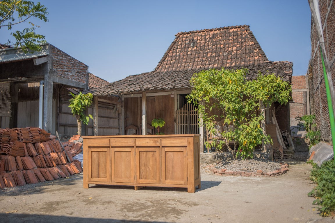 Ein stylishes Möbelstück mit einem modernen Design ist diese Kommode aus massivem Teakholz. Wie aus einem Guss wirkt die Kommode, die sowohl im Wohnbereich, als auch im Ess- oder Schlafzimmer ihre Strahlkraft entfaltet. Türen und Schubfächer kommen ohne Griffe und Beschläge aus, da sie über Griffmulden geöffnet werden, die von außen nicht sichtbar sind. Bei dem verwendeten Teakholz handelt es sich um altes Recyclingholz, das glatt abgeschliffen wurde. Kleine Unebenheiten wurden auf diese Weise geglättet und die Oberfläche erstrahlt in einem seidenmatten Glanz.