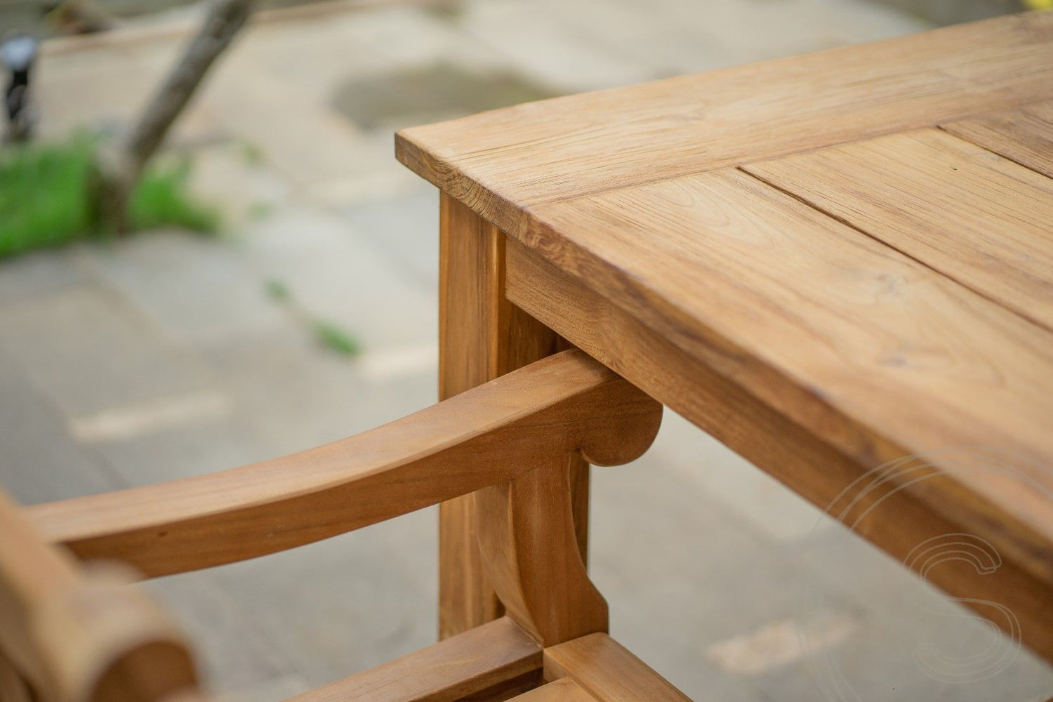 Wie die Stühle wurde auch der Gartentisch dieser Sitzgruppe aus altem Recyclingholz gefertigt. Dieses Teakholz diente einst als Baumaterial für Wohnunterkünfte auf der indonesischen Insel Java. In einem aufwendigen Prozess wurde das kostbare Holz aufbereitet und für die Möbelproduktion nutzbar gemacht. Die Tischplatte besteht aus nebeneinanderliegenden Teakholzplanken, die an den Kopfenden von einem Querstück begrenzt werden. Durch schmale Schlitze kann das Regenwasser ungehindert ablaufen und das Entstehen von Staunässe wird verhindert.