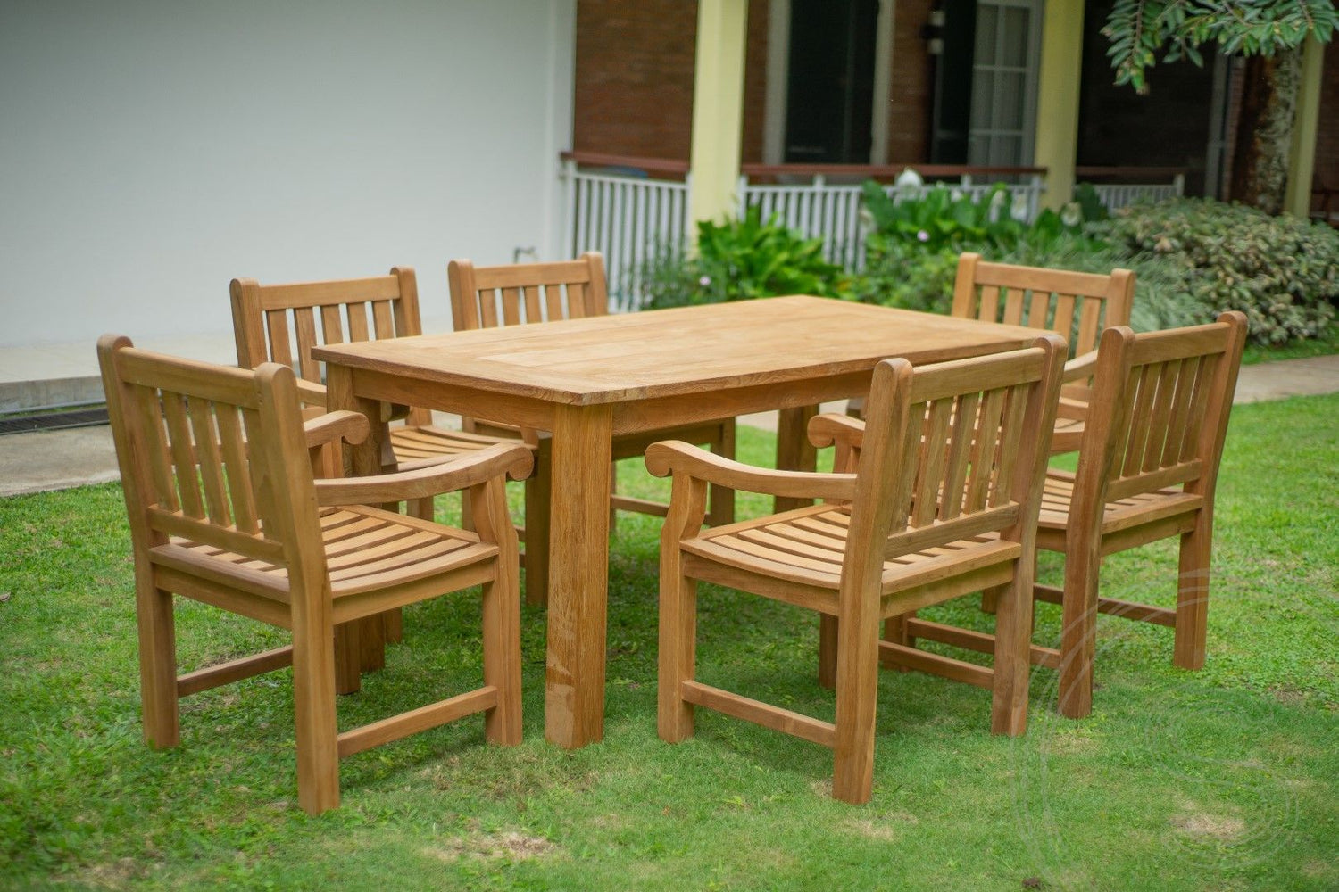 Die ideale Sitzgruppe für Gärten oder Terrassen mit eingeschränktem Platzangebot ist dieses Gartenset aus massivem Teakholz. Das Sitzensemble besteht aus einem 180 cm langen Outdoortisch und sechs Gartenstühlen aus der Kollektion Elephant. Letztere zeichnen sich durch ihre kompakte Optik und die rustikale Ausstrahlung aus. Verarbeitet wurden extradicke Teak-Kanthölzer für die Stuhlbeine und extrabreite Teak-Leisten für Sitzfläche und Rückenlehne. Die Sitzfläche der Gartenstühle ist beinahe quadratisch und hat die Maße 64 x 63 cm.