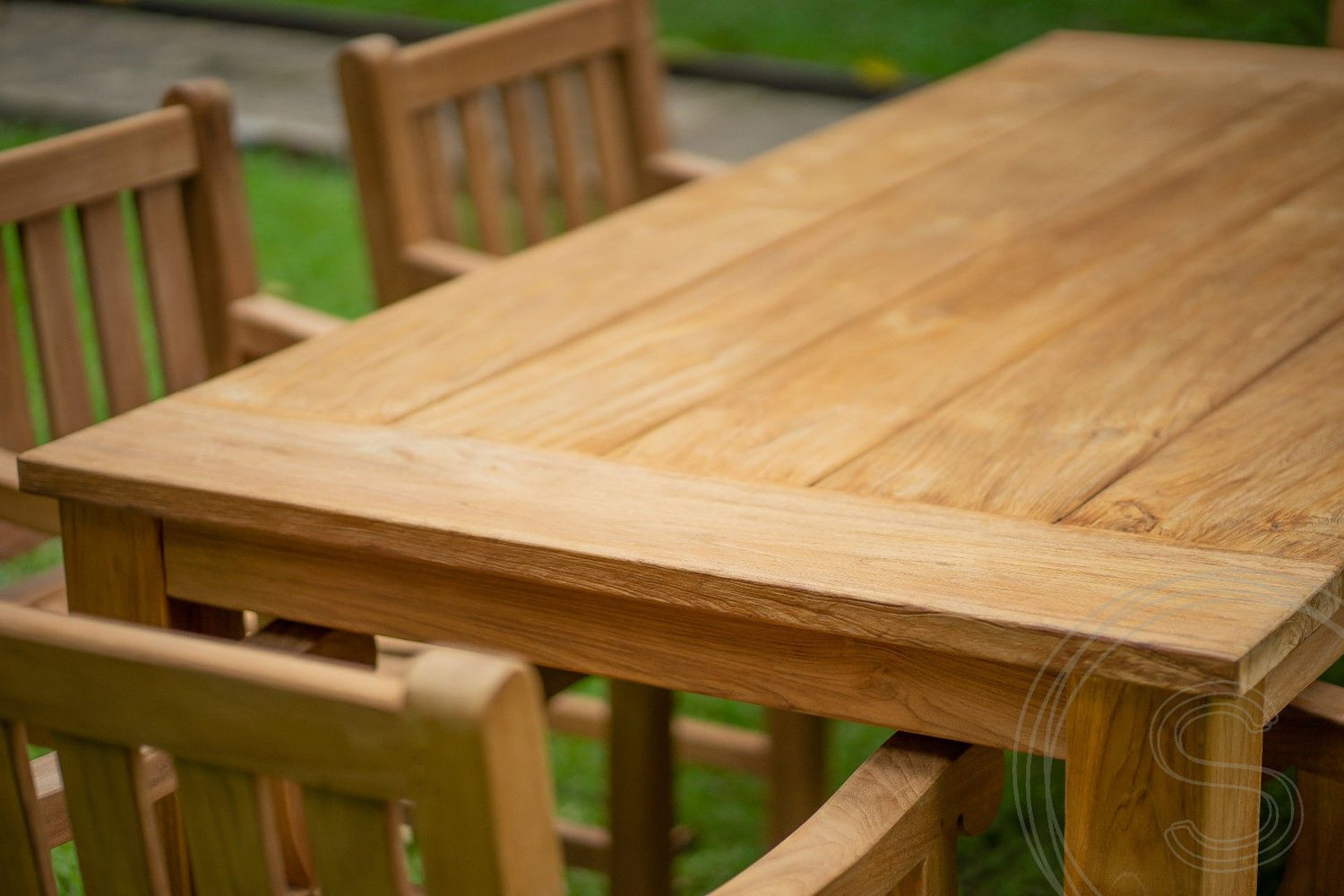 Teakholz ist pflegeleicht. Regelmäßiges Reinigen mit einem feuchten Tuch und einer milden oder grünen Seifenlösung hält das Holz in gutem Zustand. Bei Teakholz-Gartentischen empfehlen wir mindestens 1-2 Mal im Jahr eine gründliche Reinigung, um Ablagerungen wie Algen oder Moos vorzubeugen. Bei Tischen mit Schraubbeinen jährlich prüfen, ob alles fest sitzt.