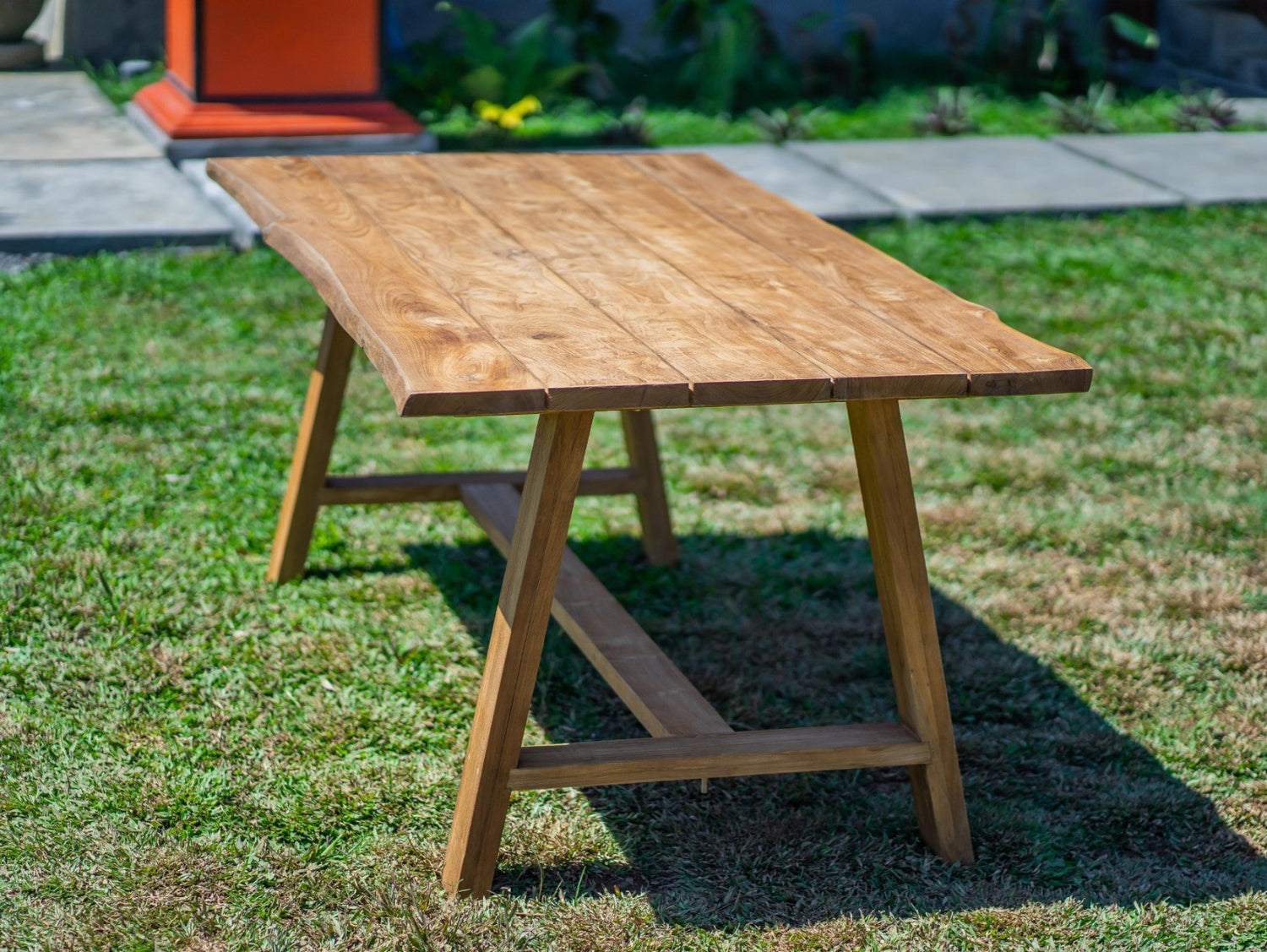 Gefertigt aus hochwertigem Teakholz, steht diese Tisch für Stabilität und Langlebigkeit. Das robuste Material trotzt Witterungseinflüssen und behält auch im Außenbereich seine Schönheit über viele Jahre hinweg. Die feine Maserung verleiht jeder Bank einen individuellen Charakter und macht sie zu einem echten Unikat für stilvolle Außenräume.