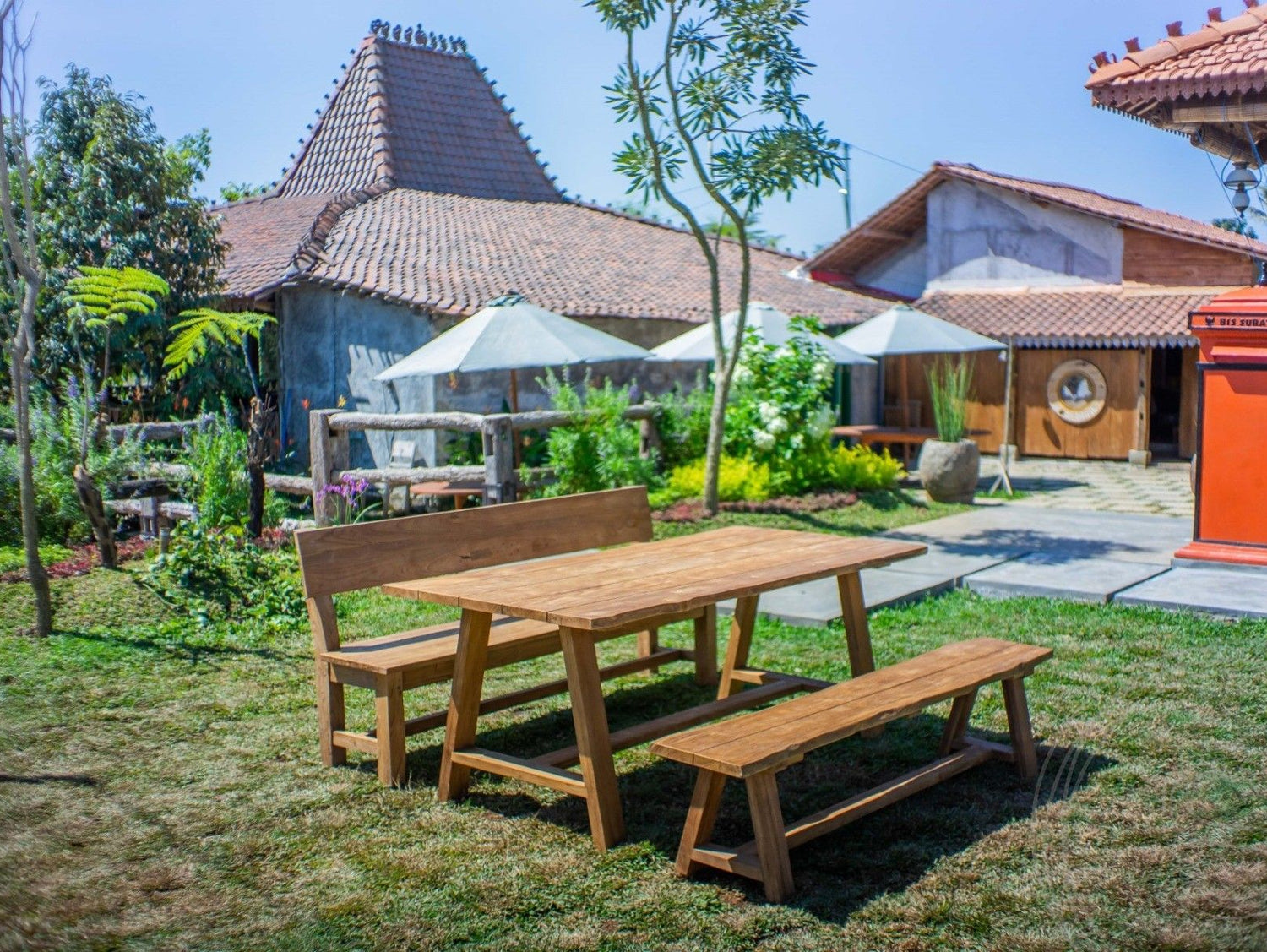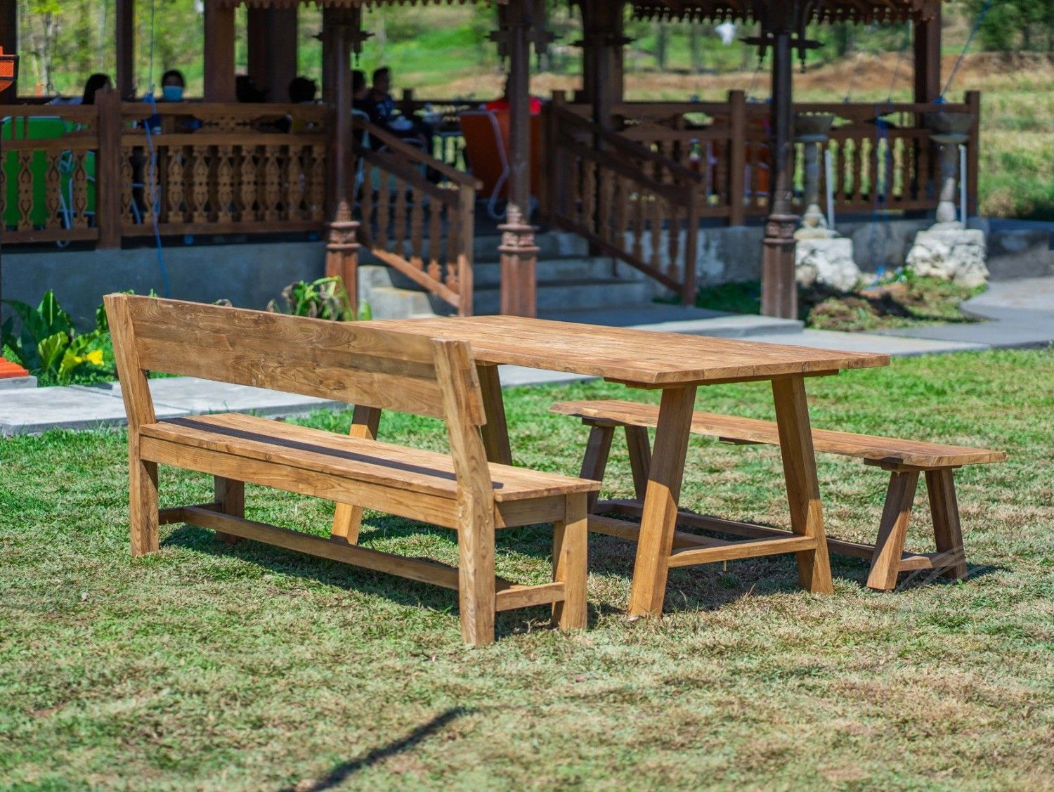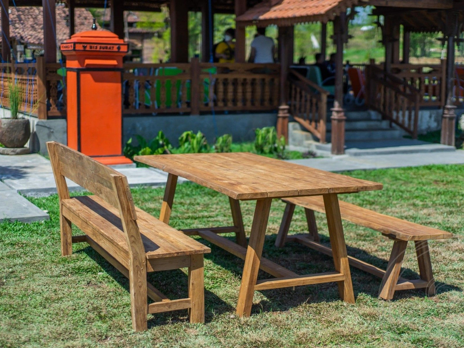 Die Sitzflächen der Gartenbänke und die Tischplatte wurden aus einzelnen Teakholz-Planken gefertigt, zwischen denen sich eine schmale Aussparung zum Ablaufen des Regenwassers befindet. Teakholz ist wasserunempfindlich und kann auch bei regnerischem Wetter im Außenbereich verbleiben, ohne dass besondere Schutzmaßnahmen ergriffen werden müssen. Der Gartentisch und die Bank ohne Lehne besitzen einen Unterbau, bei dem die Beine eine klassische A-Form bilden. Dies ist ein charakteristisches Designmerkmal der Teakmöbel-Kollektion Java. Sämtliche Gartenmöbel wurden auf der gleichnamigen indonesischen Insel hergestellt.