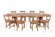 Diese rustikale Sitzgruppe aus massivem Teakholz besteht aus einem ovalen Tisch mit einer Länge von 300 cm und acht passenden Stühlen. Das Design des Tisches und der Stühle wurde exakt aufeinander abgestimmt und überzeugt durch die harmonische Linienführung. Die Tischplatte besitzt eine ovale Form und ruht auf zwei bauchigen Sockeln. Den unteren Abschluss bilden jeweils drei geschwungene Füße, die dem Tisch Standfestigkeit verleihen. Die robuste Ausstrahlung erhält der Tisch durch die Verwendung von recyceltem Teakholz bei der Herstellung. Dieses charaktervolle Holz überzeugt durch seine natürliche Ausstrahlung und seinen seidenmatten Glanz.